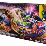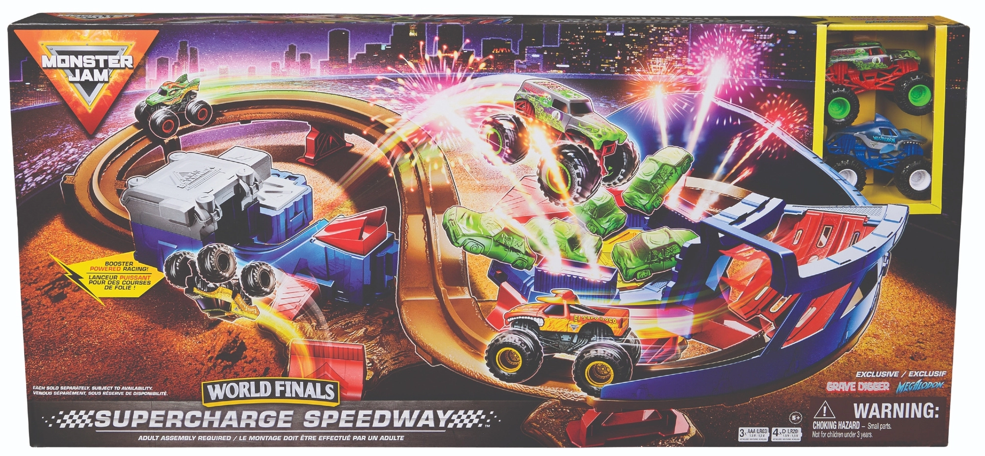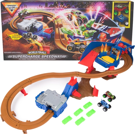Set MONSTER JAM Supercharge Speedway spremeni mizo ali tla v adrenalinsko areno. Ročno upravljan izstreljevalnik pošlje tovornjake v visoke hitrosti, medtem ko dvignjeni odseki, mostovi in zavoji vodijo naravnost v osvetljeno crash cono za efektne trke in pristanke. Po odpeljanem krogu se vozila vrnejo na start – zabava teče brez prekinitev.