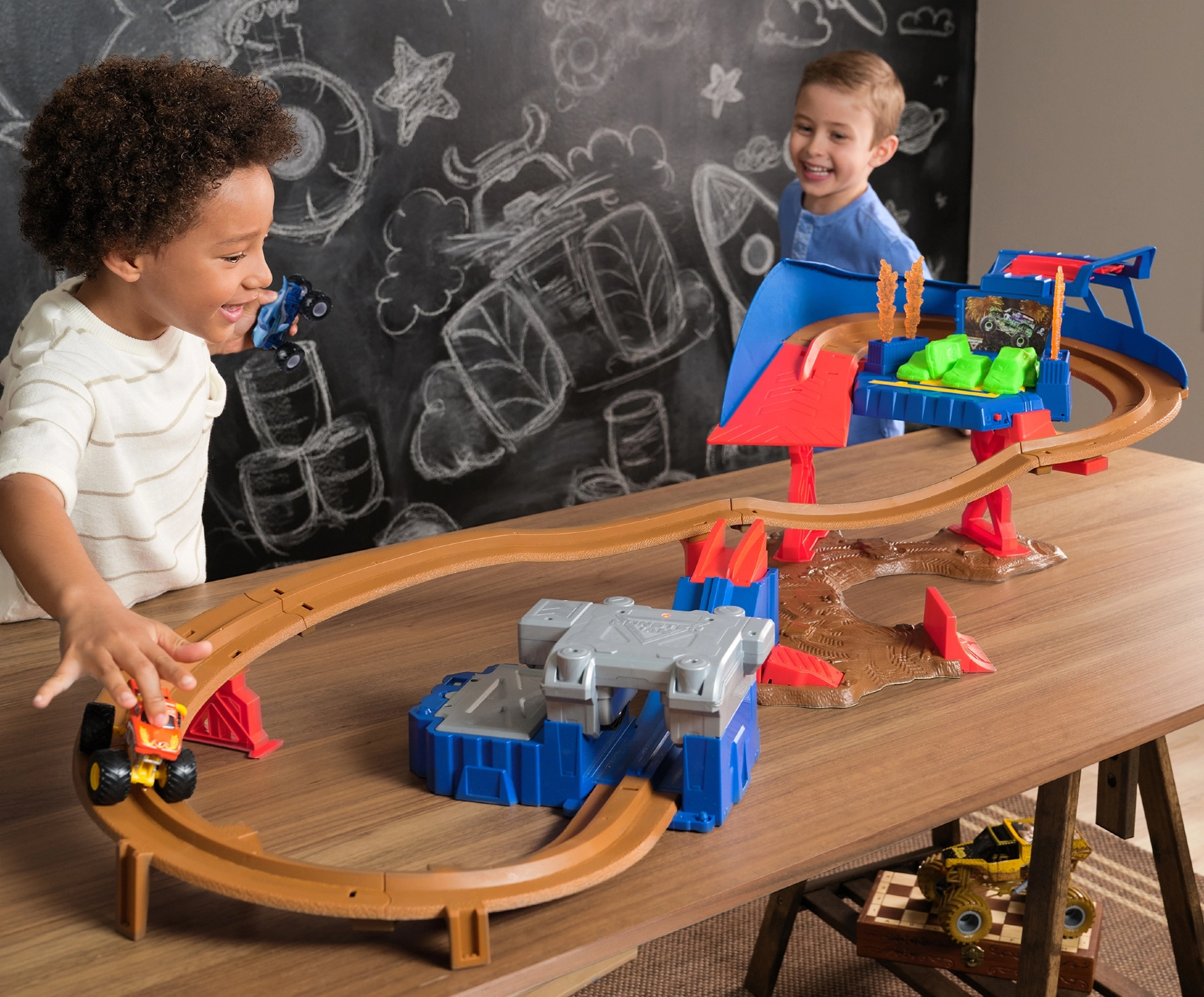 Poženite domačo areno MONSTER JAM na polno! Ta kaskaderski dirkalni set s svetlobnimi efekti prinaša ročni izstreljevalnik, hitre zavoje, ciljno crash cono in tekoč krog za neprekinjeno vožnjo. Vključuje 2 kovinska tovornjaka v merilu 1:64 znamke SPIN MASTER – idealna za akcijske dirke, skoke in trke s kaskaderskimi vragolijami.