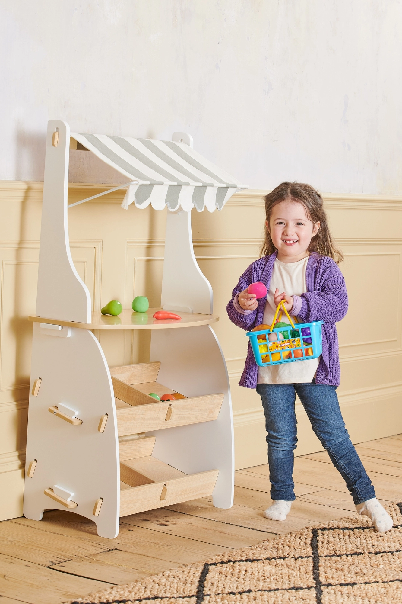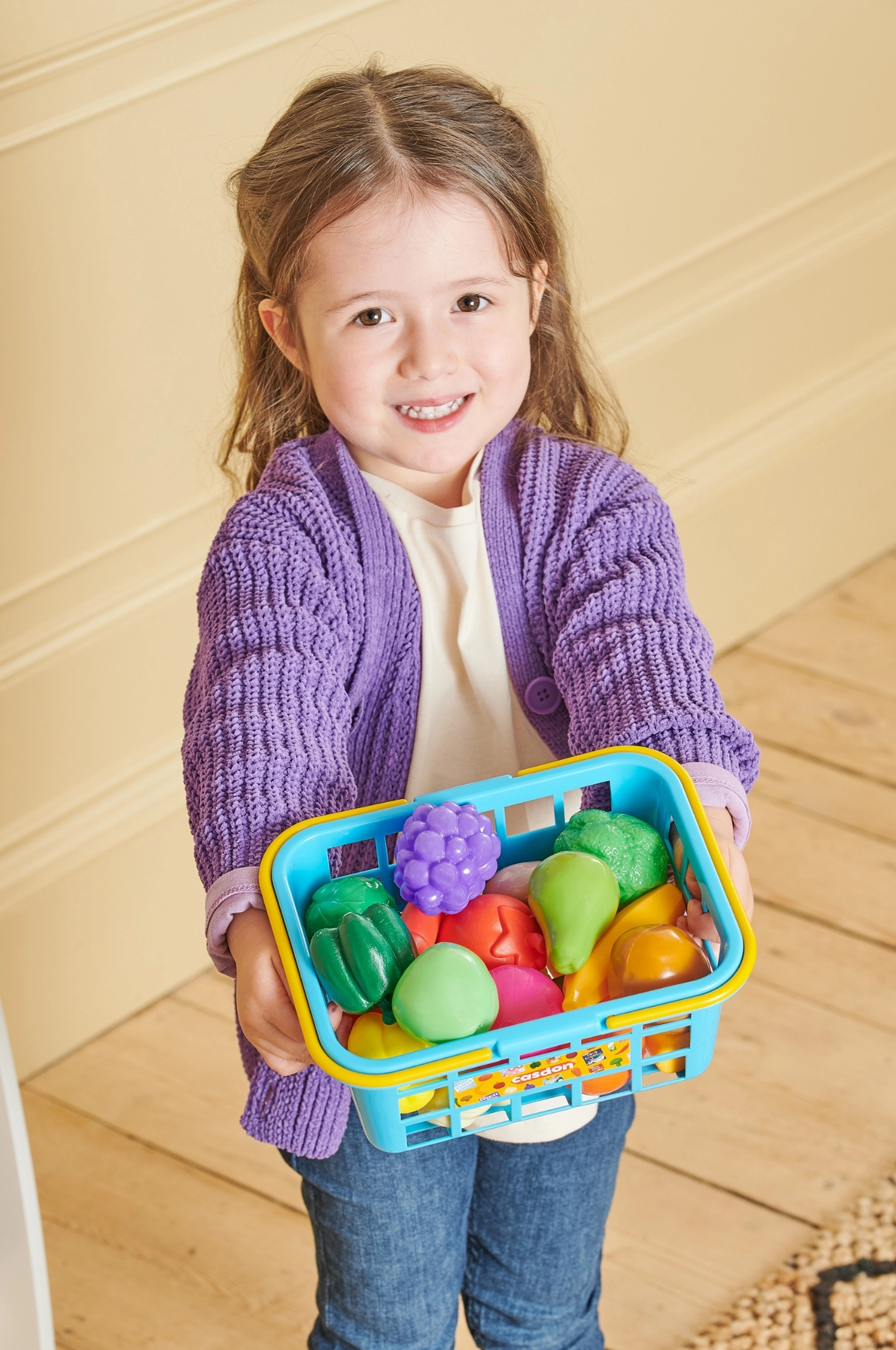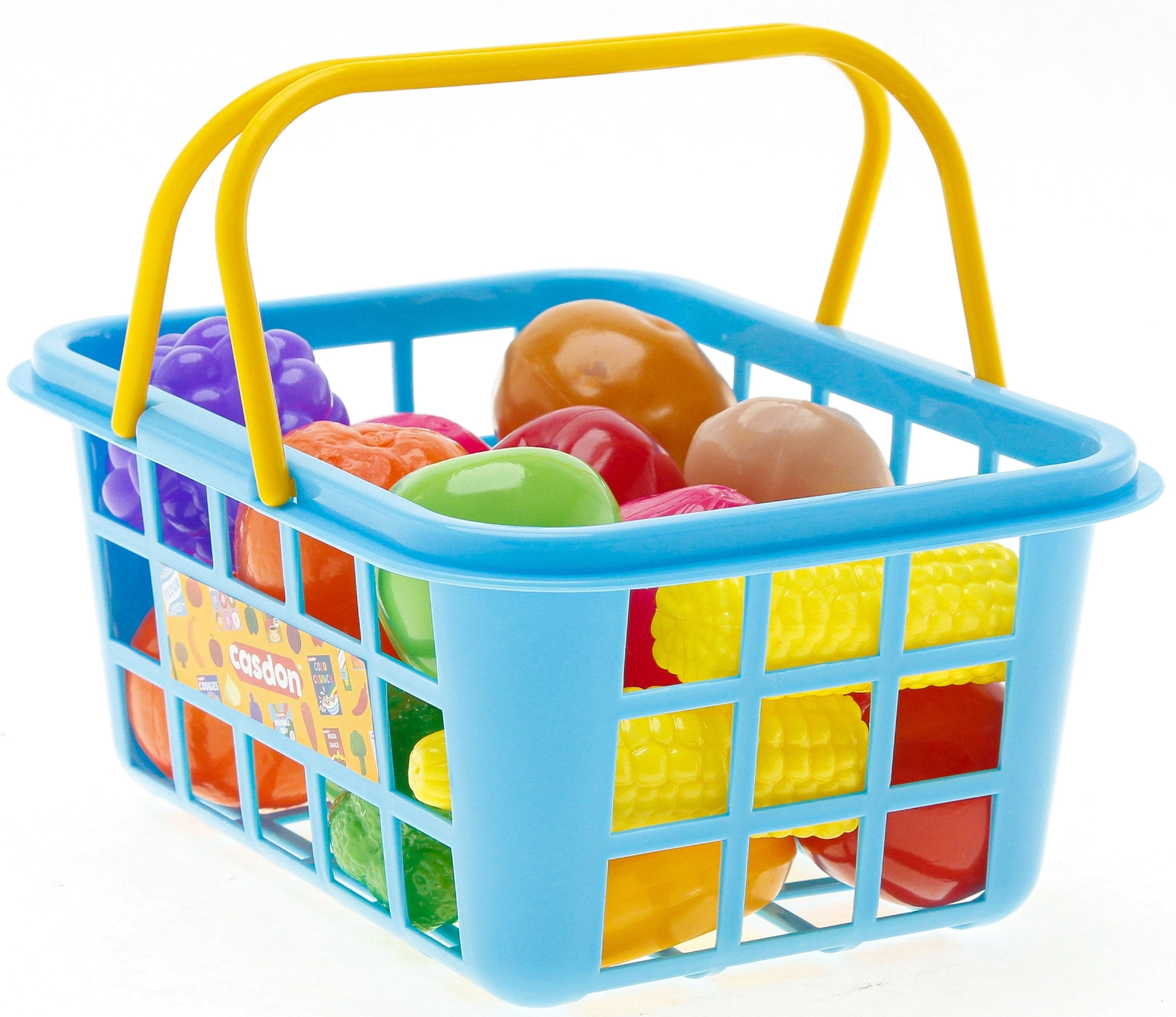 Realistična igra trgovine s košaro CASDON otrokom prinaša veliko zabave in učenja. Lahka košara v modri barvi z rumenimi preklopnimi ročaji se zlahka nosi, številna barvita živila pa spodbujajo domišljijo in komunikacijo.