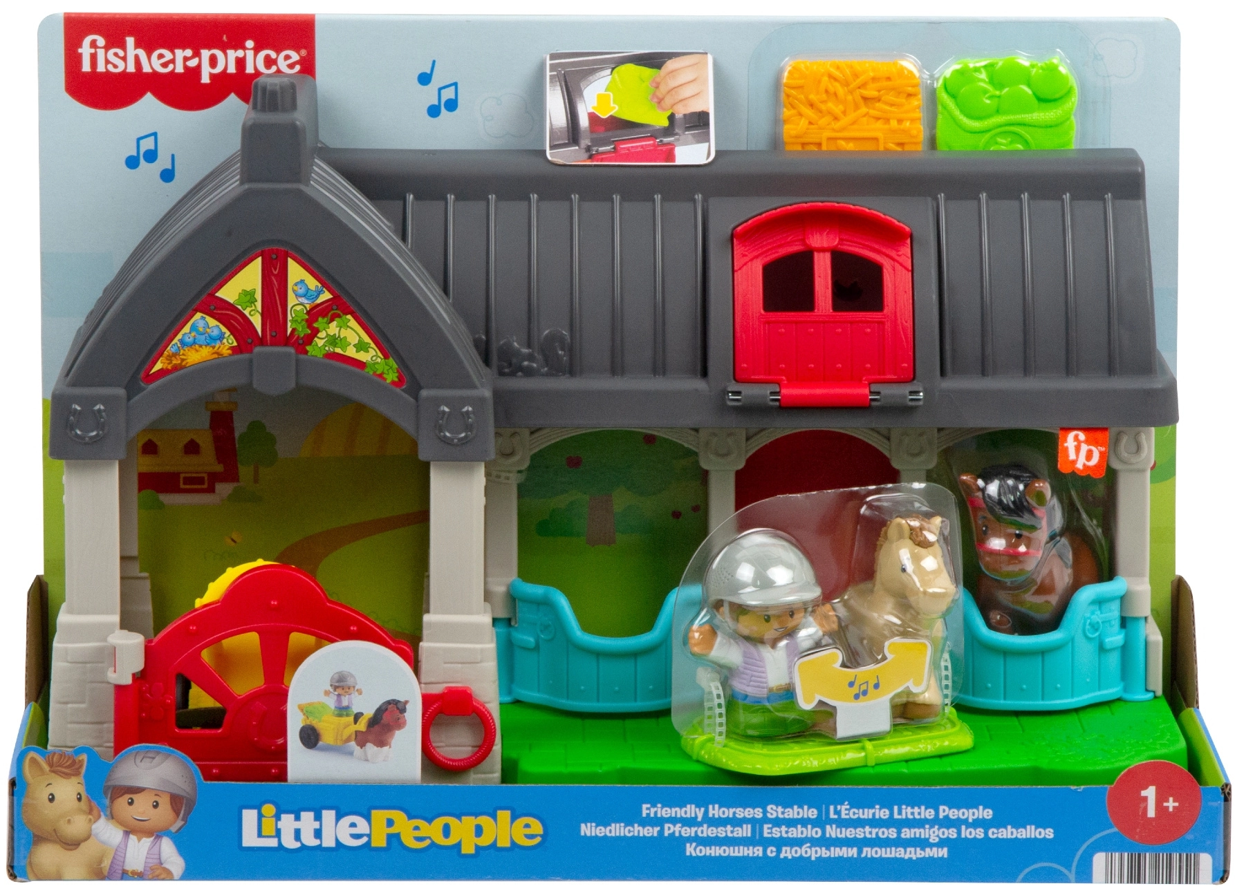 Veseli hlev Little People otrokom približa svet živali na dosegu roke. Dva ločena dela za raziskovanje, odpirajoča se vrata boksov in posebna odprtina za »hranjenje« spremenijo vsako igro v novo zgodbo. Otroci lahko vprežejo večjega konjička v prikolico, prevažajo »seno« in skrbijo za svoje konjičke s pomočjo figurice oskrbnika.
