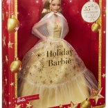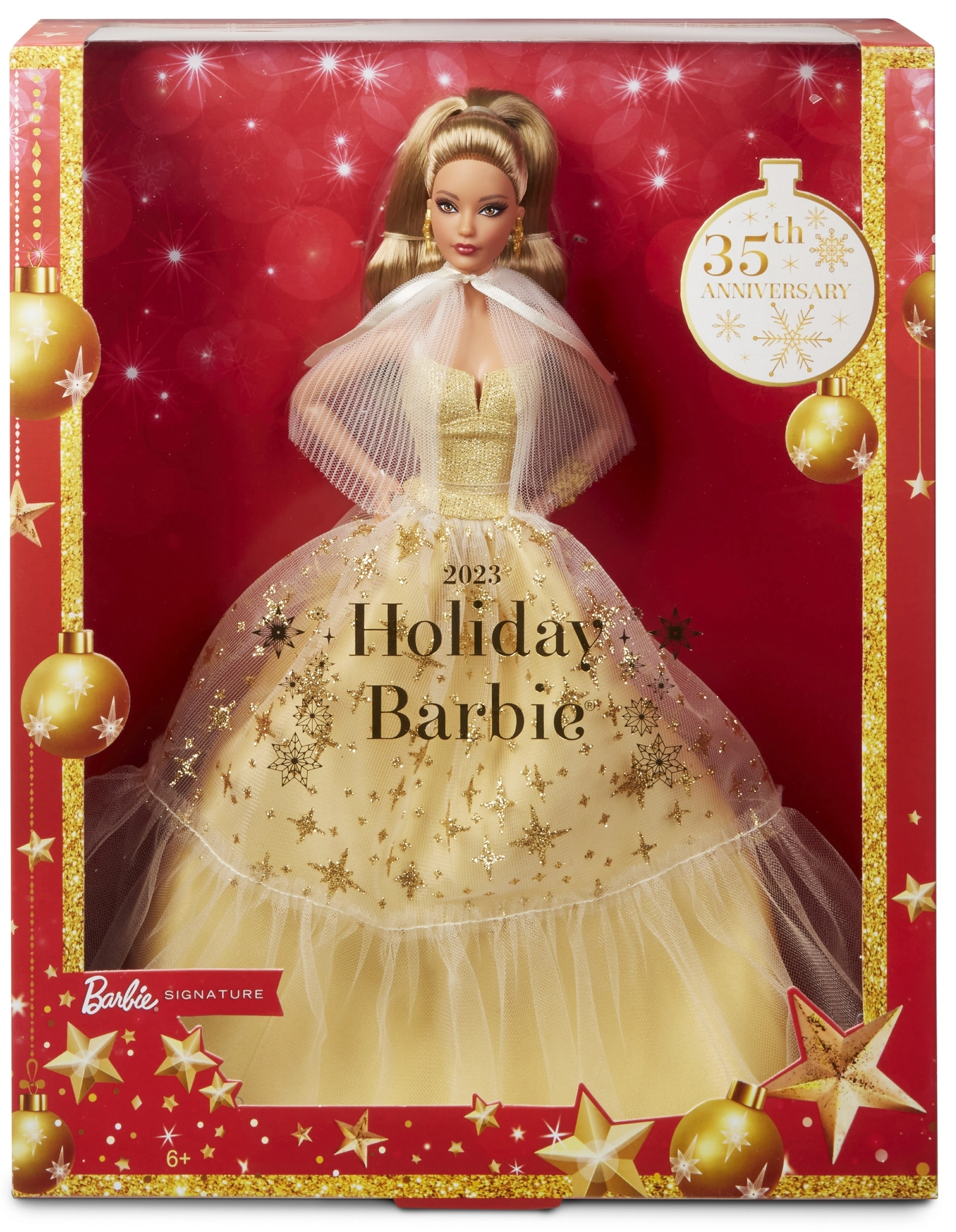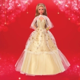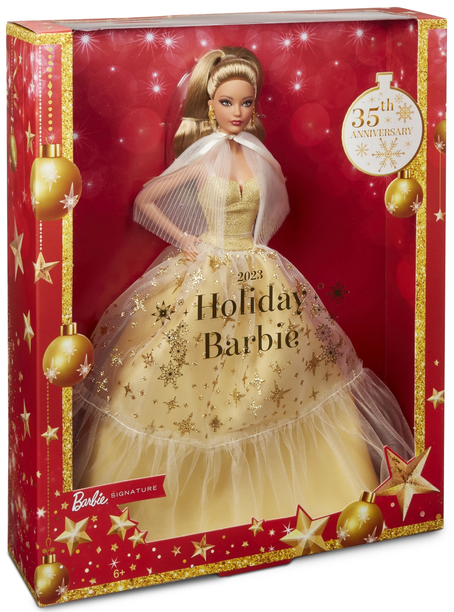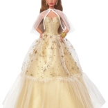 Elegantna zbirateljska punčka BARBIE ob 35. obletnici zažari v satenasti obleki v odtenku šampanjca s tilastim krilom, posutim z zlatimi zvezdami. Ne manjka plisiran prosojen pelerín, zlat nakit ter natančni detajli ličenja in manikire. Idealno božično darilo in dragulj vsake zbirke.
