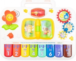 Mini klavir s številčnimi in solmizacijskimi tipkami, vrtljivimi kolescami in gumbi prinaša zabavne zvoke ter svetlobne učinke. Podpira sluh, ritem in prve glasbene veščine.