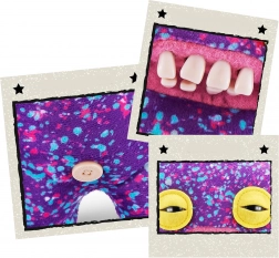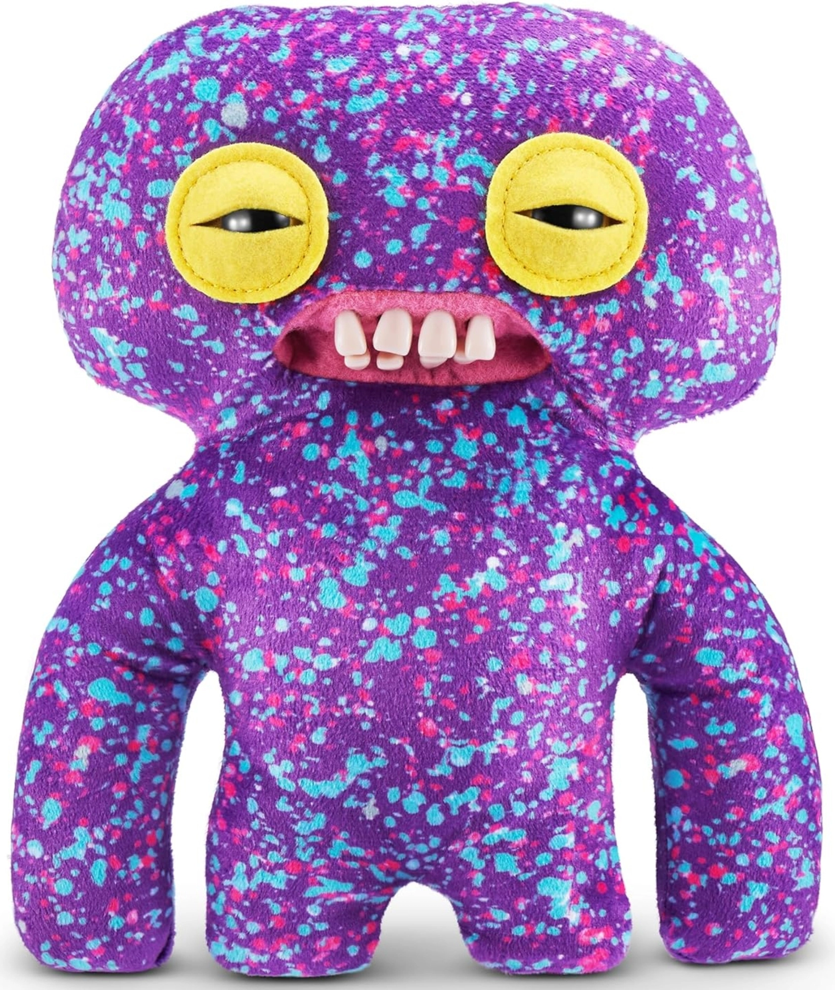 Plišastek FUGGLER Squidge znamke Spin Master očara na prvi pogled s svojim neobičajnim videzom. Vijolično telo krasijo kontrastne lise v modrih in rožnatih tonih, ki ustvarjajo umetniški, celo abstrakten učinek. Dominantno vlogo ima komično strašljivi nasmeh z zobmi, ki igrači daje značilen šarm in humor.