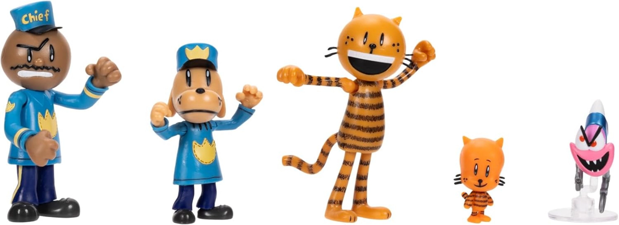 Komplet vsebuje pet ikoničnih likov: Chief, Dog Man, Petey, Lil’ Petey in Flippy. Zaradi kombinacije junakov in negativca bodo otroci zlahka ustvarili napete prizore ter razvijali domišljijo in pripovedovanje zgodb.