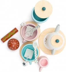 Stilski otroški čajni set v pastelnih barvah je idealen za prve družabne igre. Vsebuje čajnik, posodico za sladkor, skodelice s podstavki, žličke, čajne vrečke in lesene priboljške – vse iz trpežnega lesa s precizno izdelavo. Set podpira igro vlog, učenje pravil pri mizi in vadi koordinacijo roka–oko.