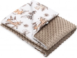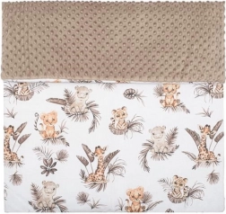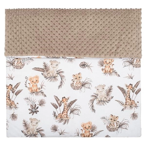 Obojestranska odeja Safari prinaša otrokom udobje in senzorično stimulacijo. Ena stran je iz mehke tkanine minky s 3D izboklinami za nežno senzomotorično stimulacijo, druga iz 100% bombaža z izvirnimi podobami, ki razvijajo domišljijo ter zaznavanje barv in oblik. Zahvaljujoč antialergijskemu polnilu je odeja mehkejša, toplejša in primerna za celoletno uporabo.