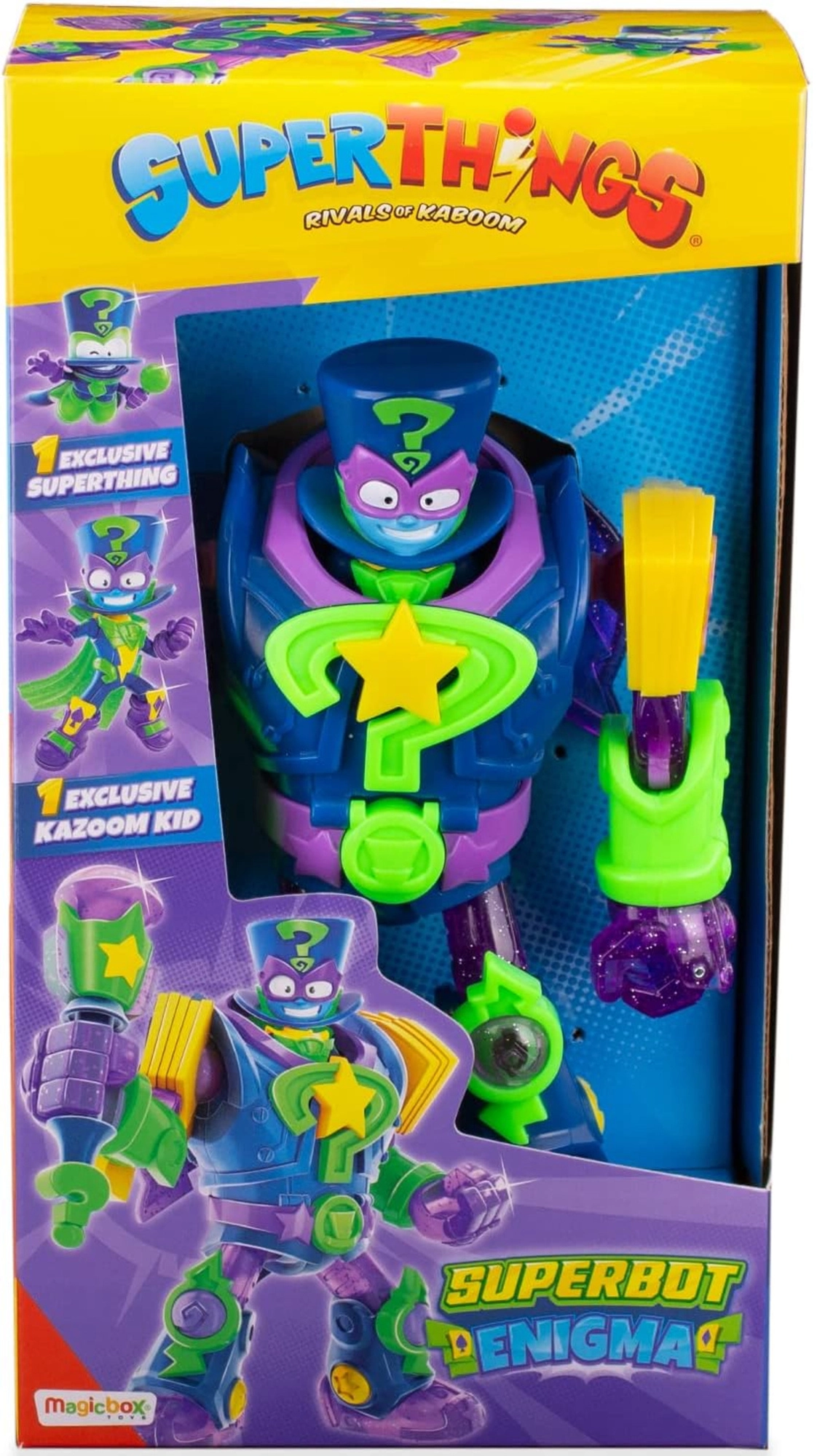 SuperThings Enigma Superbot združuje izrazit dizajn, funkcionalne mehanizme in napete igralne možnosti. Zaradi premičnih rok in nog lahko robota enostavno postavljate v poze in ustvarjate akcijske prizore. S pritiskom na gumb se razprejo mehanična krila za dramatične pobege in lete nad Kaboom Cityjem.