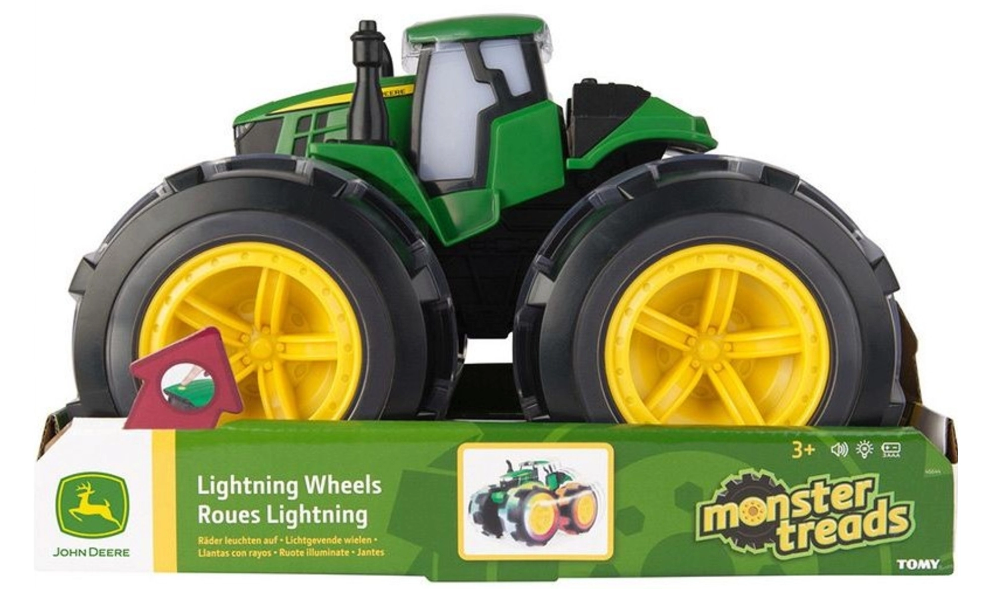 Priljubljeni traktor John Deere Monster Treads Lightning Wheels bo razveselil vsakega otroka, ki ima rad kmetijske stroje in dinamično vožnjo. Robusten plastičen dizajn, orjaške pnevmatike in svetlobni učinki spremenijo vsako igro v posebno doživetje.