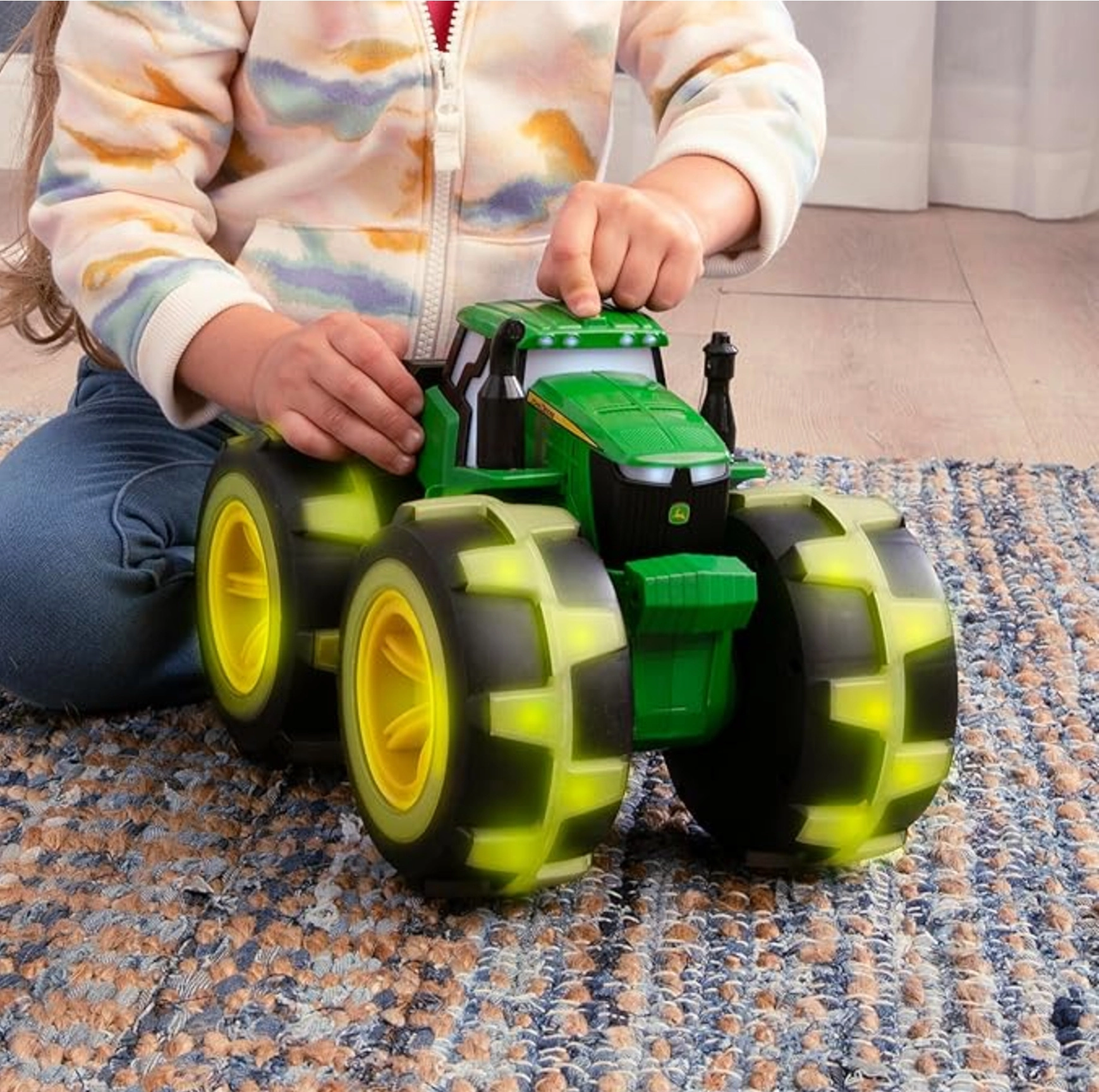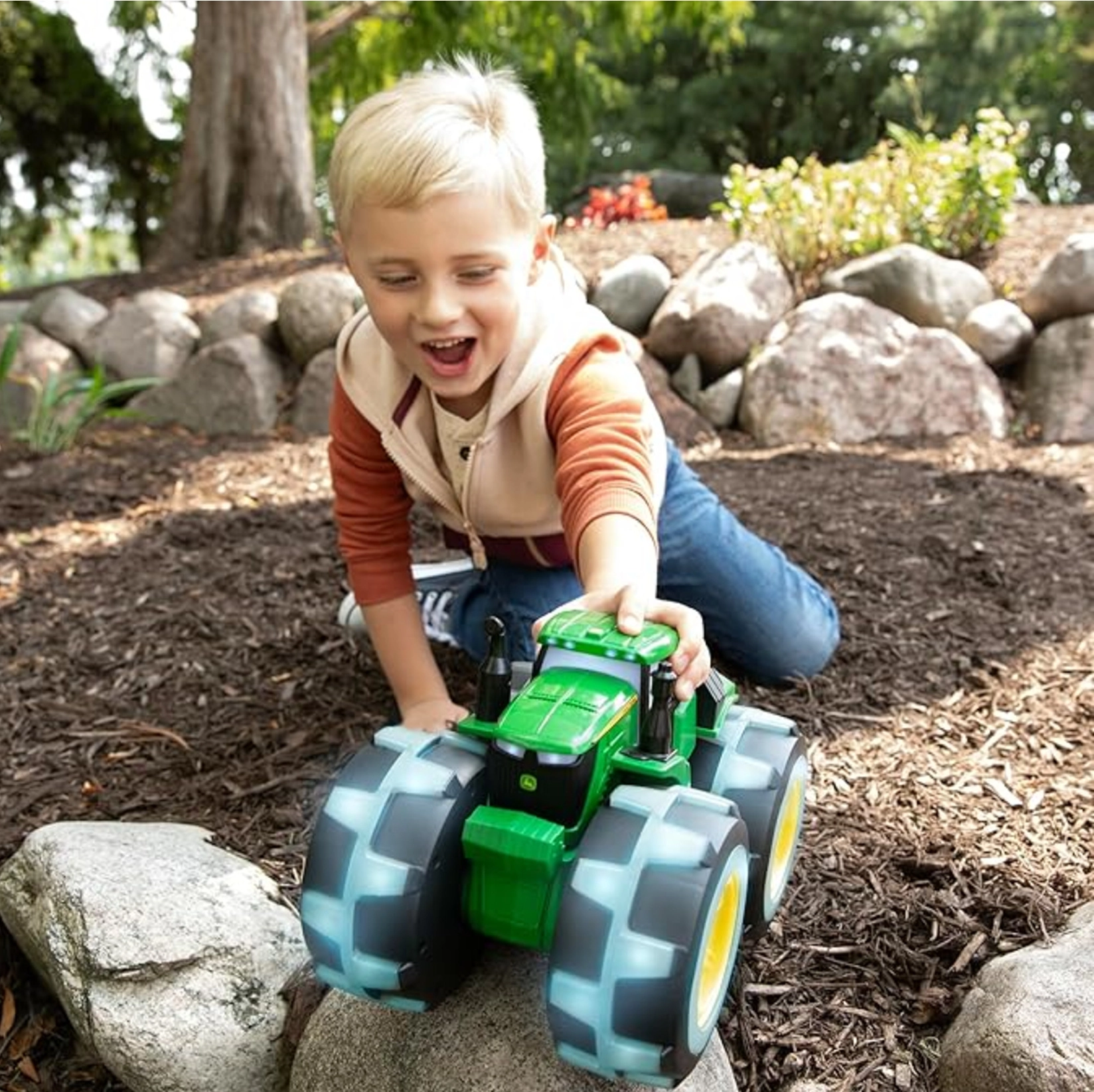 Zeleni traktor z licenco John Deere znamke Tomy ponuja svetleča kolesa, zvočne učinke in vzdržljivo zasnovo za zabavo doma in na prostem. Dovolj je pritisniti en gumb na strehi in uživati v svetlobnih LED učinkih ter realističnih zvokih motorja. Velika terenska kolesa z odlično trakcijo obvladajo preproge in vrt.