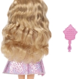 Aurora ima mehke, goste in valovite blond lase, ki jih je mogoče česati in urejati v različne pričeske. Priložen je rožnat glavniček za enostavno razčesavanje.