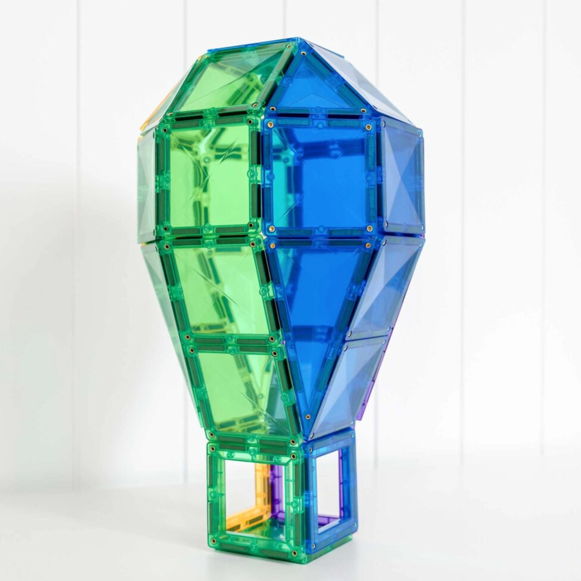 Različne oblike in prozorne barve omogočajo sestavljanje gradov, stolpov, mostov in raket. Otroci med igro naravno odkrivajo geometrijo in prostorske odnose.