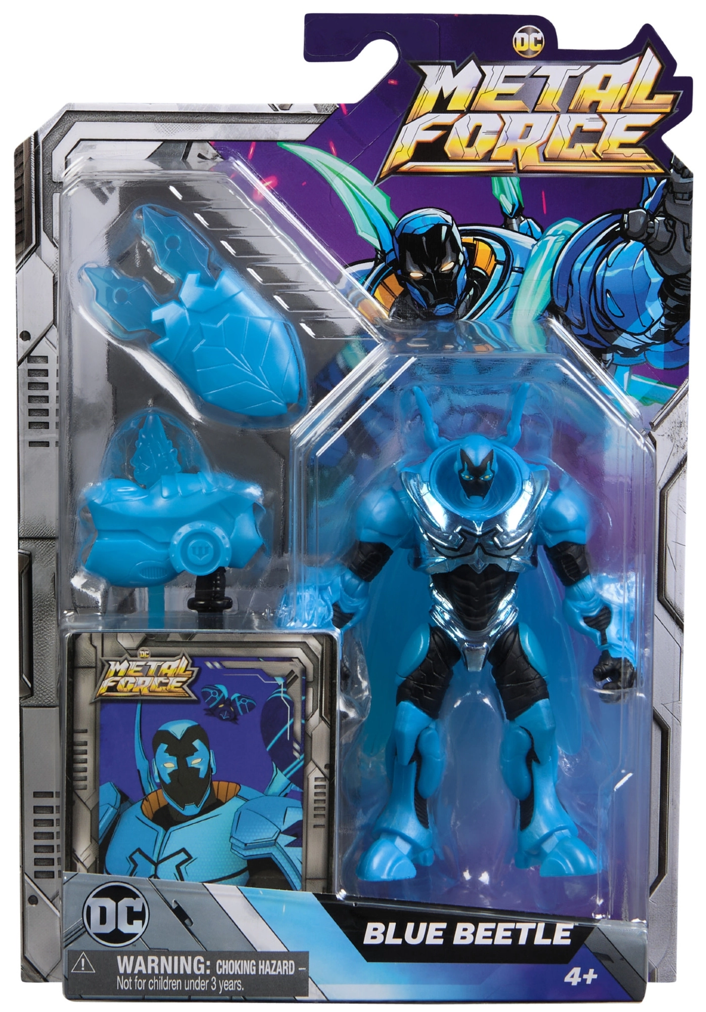 V paketu najdete tematsko dodatno opremo – ščite, orožje in krila, ki okrepijo domišljijsko igro. Priloženi sta tudi kartica lika in stojalo za stilno razstavitev. Figurica je izdelana pod uradno DC licenco in verno ujame videz BLUE BEETLE.