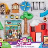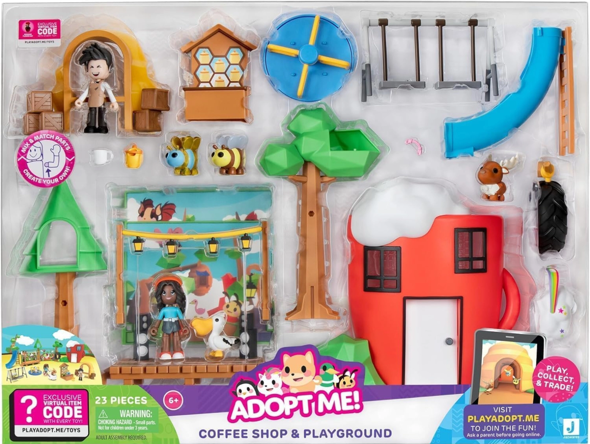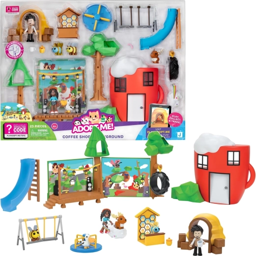 Odkrijte dve ikonični lokaciji z otoka ADOPT ME! v enem setu – prijetno kavarno in pisano igrišče. Otroci lahko pripravljajo pijače za pultom, posedejo goste za mizice, nato pa se razmigajo na toboganu, gugalnicah in vrtiljaku. Zahvaljujoč modularnim elementom je prizore preprosto preurejati in ustvarjati nove zgodbe.