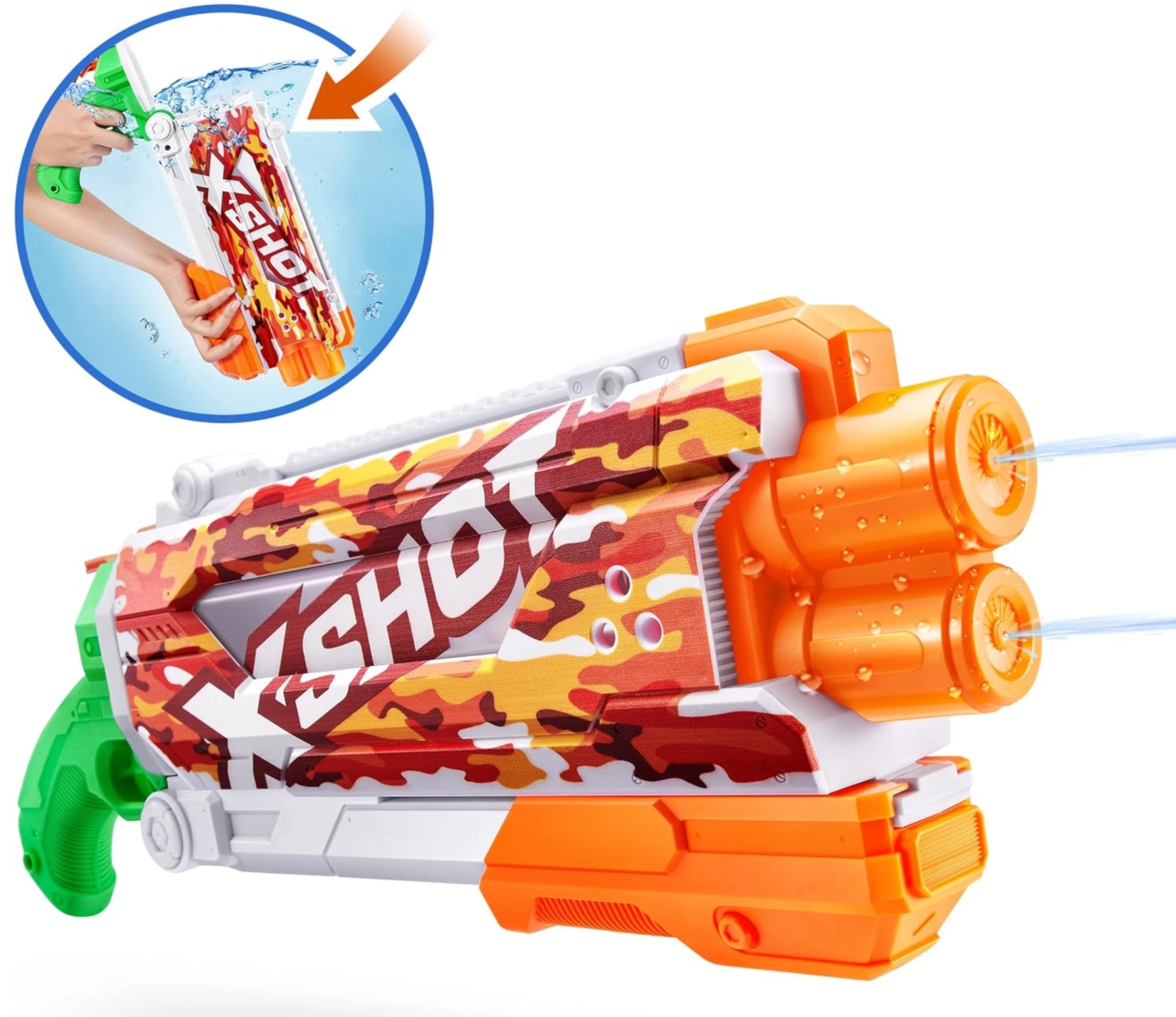 Vodna pištola ZURU X SHOT SKINS Fast-Fill Sun Camo prinaša hitro dolivanje vode in močan curek za maksimalno zabavo. Inovativen sistem Fast-Fill omogoča dolivanje neposredno iz pipe ali vedra v eni sami sekundi, zato se hitro vrnete v akcijo. Z dosegom do 10 m boste zadeli nasprotnika natančno in učinkovito.