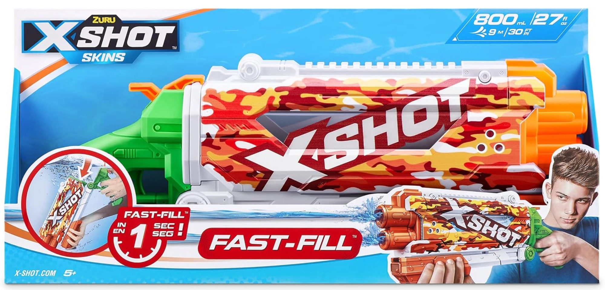 Doživite poletne vodne bitke na polno z vodno pištolo ZURU X SHOT SKINS Fast-Fill Sun Camo. Zahvaljujoč mehanizmu Fast-Fill rezervoar napolnite v 1 sekundi, doseg je do 10 metrov, dolžina 49 cm pa zagotavlja odličen oprijem in večjo kapaciteto. Trpežna izdelava in izrazit dizajn Sun Camo sta idealna za plažo, vrt in igrišče.