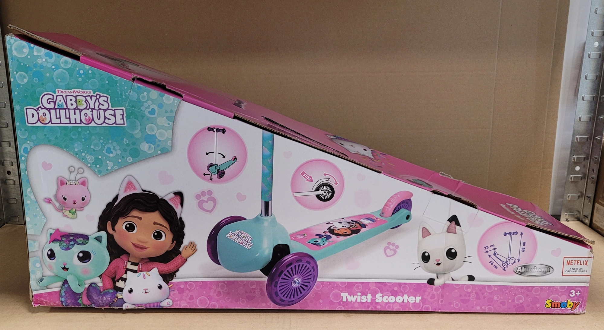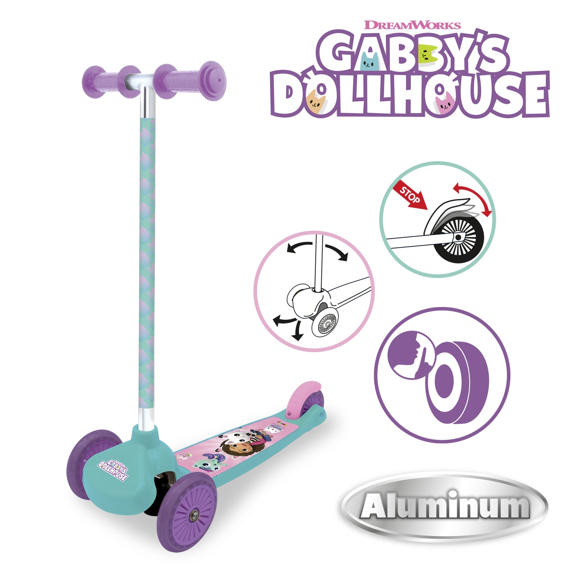 Ta trikolesni skiro v turkizno‑vijolični barvni kombinaciji z grafiko priljubljenih junakov iz GABBY’S DOLLHOUSE je odlična izbira za male voznike od 3 let dalje. Zahvaljujoč dvema sprednjima kolesoma je izjemno stabilen, lahka konstrukcija olajša rokovanje, nožna zavora na zadnjem blatniku pa zagotavlja varno upočasnjevanje in ustavljanje.