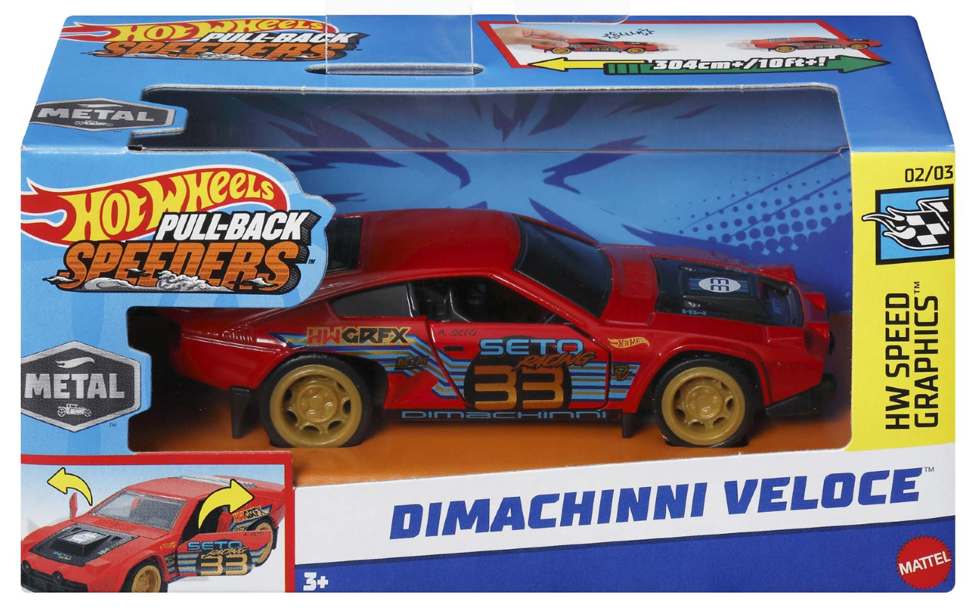 Model HOT WHEELS Dimachinni Veloce ponuja vznemirljivo vožnjo zahvaljujoč pull-back pogonu, ki ga imajo otroci radi. Večja velikost v primerjavi z običajnimi avtomobilčki, natančno oblikovane linije in efektna rdeča izvedba ga naredijo za izrazit kos vsake zbirke.