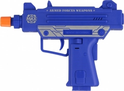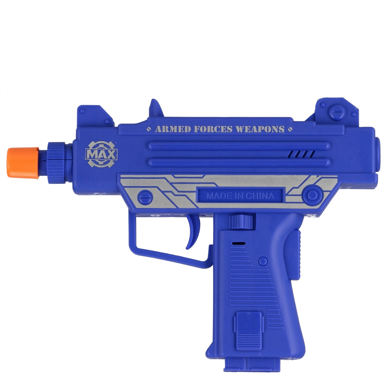 Plastično orožje z oranžnim varnostnim vrhom in oblikovanim ročajem je zasnovano za udoben oprijem in varno igro otrok.
