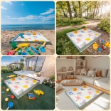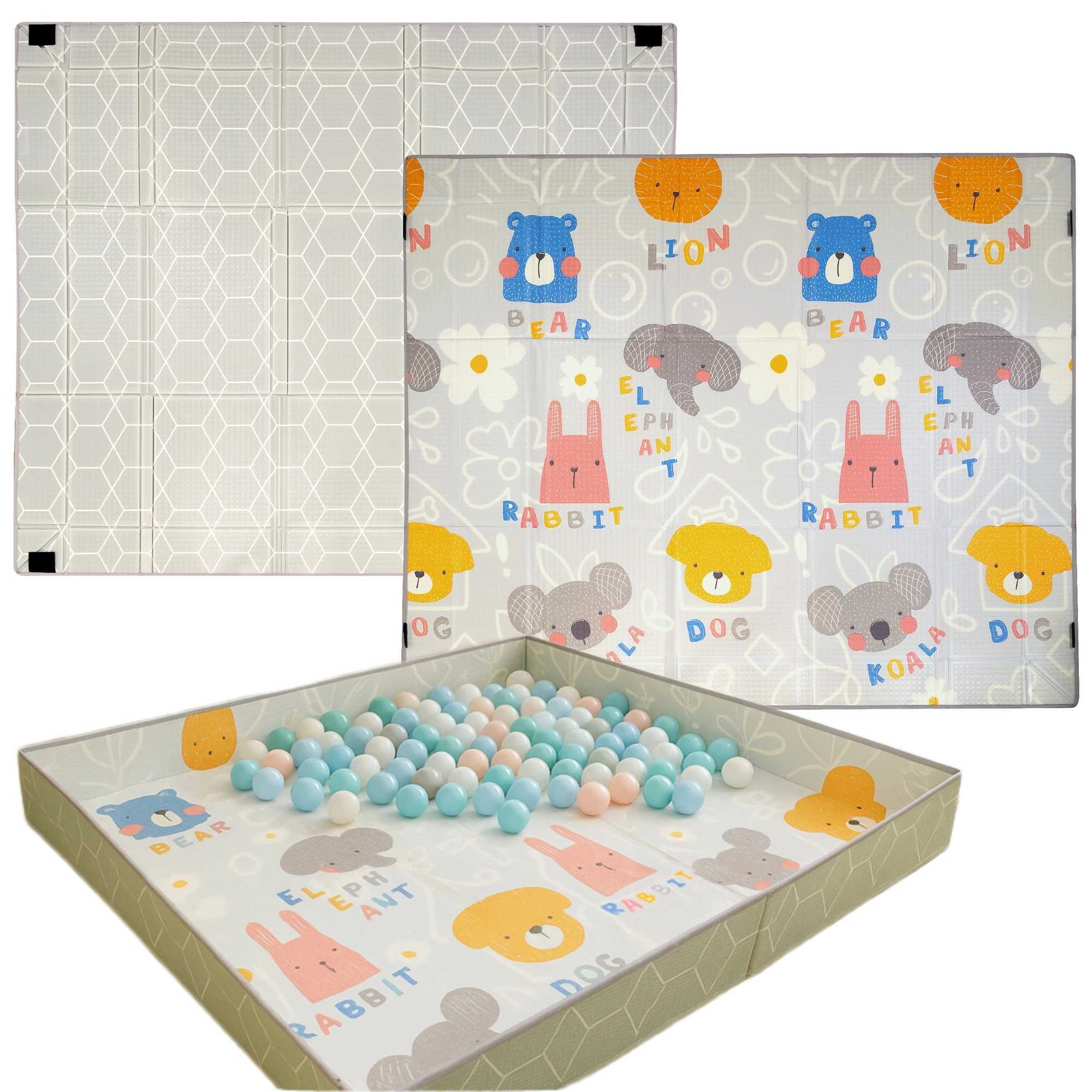 Posebni ježki omogočajo, da v hipu dvignete robove in ustvarite mehak ograjen prostor ali ball pit – dodajte le žogice. Podloga je zložljiva, lahka in enostavna za čiščenje (zadostuje vlažna krpa). V paketu prejmete tudi praktično transportno torbo z zadrgo za udobno shranjevanje in prenašanje.