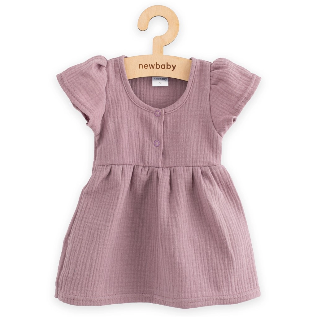 Odkrijte čar mušelina v otroški oblekici New Baby v nežnem sivkino lila odtenku. Zaradi lahke in zračne strukture tkanine je obleka izjemno udobna tudi v toplih dneh. A-kroj s kratkim rokavom in nabrano krilcem zagotavlja svobodo gibanja in udobje skozi ves dan.