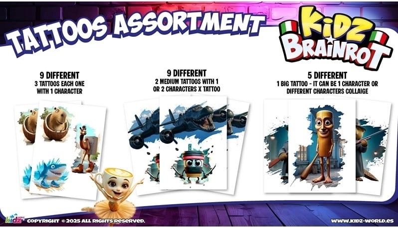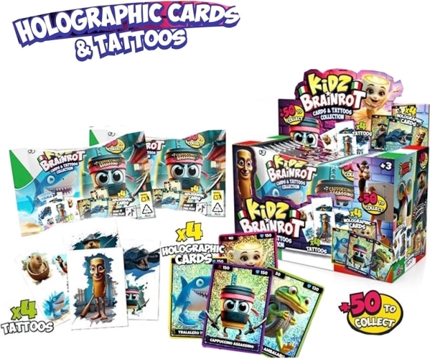 Paket Italian Brainrot prinaša dozo zabave in zbirateljskega vznemirjenja. V vsakem paketu prejmete 4 kartice in 4 začasne tetovaže s tematiko Italian Brainrot, vedno v naključnem miksu motivov. Super za izmenjavo s prijatelji, zbiranje najljubših dizajnov in popestritev sloga.
