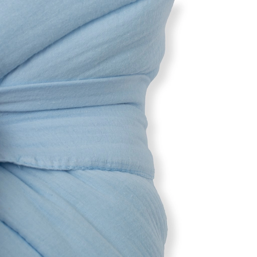 Muslin sodi med najčistejše in najmehkejše tkanine. Njegova lahka struktura omogoča optimalno kroženje zraka, zato dojenček ostane na toplem, brez nepotrebnega pregrevanja. Povijalka je idealna za miren spanec, dojenje in za voziček.