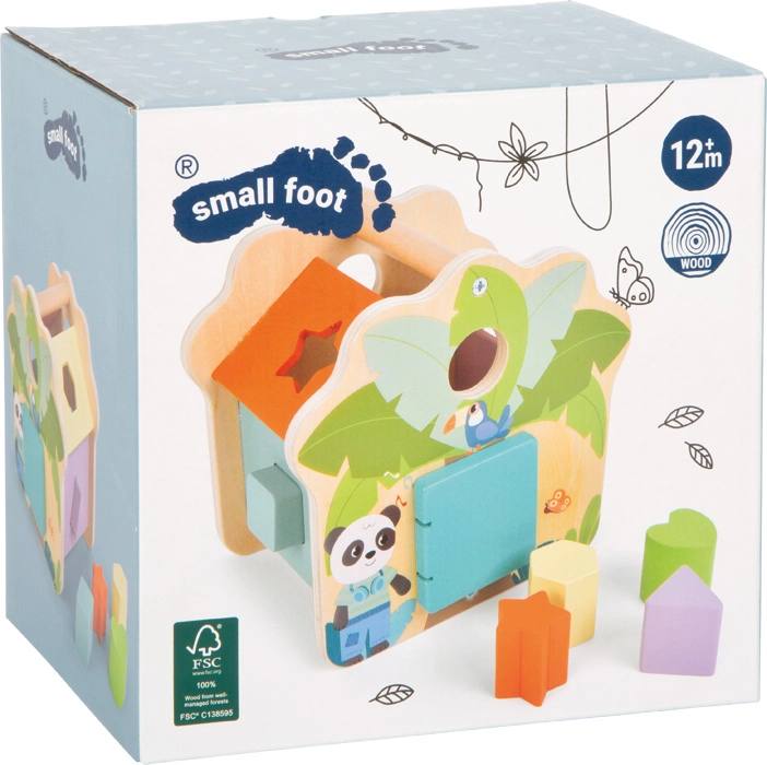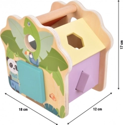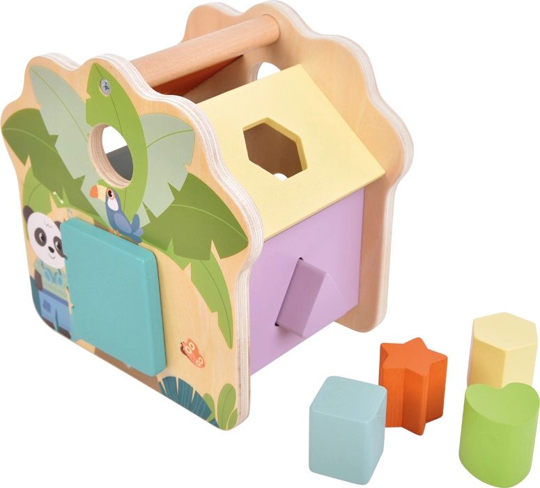 Lesena hišica za vstavljanje oblik z ljubkimi ilustracijami pande, tigra in palm popelje otroke v svet barv in oblik. Pet različnih kock pomaga trenirati natančnost gibov in potrpežljivost – po vstavljanju vseh delov se vratca zlahka odprejo in zabava se lahko začne znova.