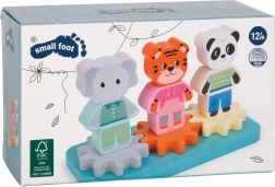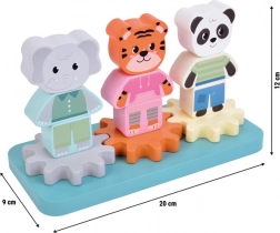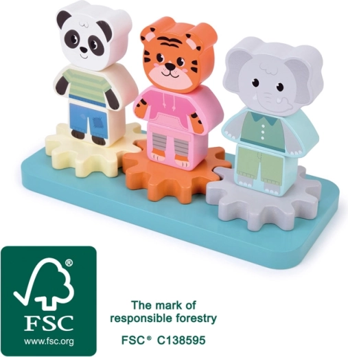 Tri ljubke figurice – slon, tiger in panda – so sestavljene iz barvnih, zložljivih delov, ki jih otroci lahko razvrščajo, kombinirajo in postavljajo eno na drugo. Pameten sistem zobnikov povezuje vse figurice: z vrtenjem ene se zavrtijo vse, zato otroci takoj vidijo vzrok in posledico.
