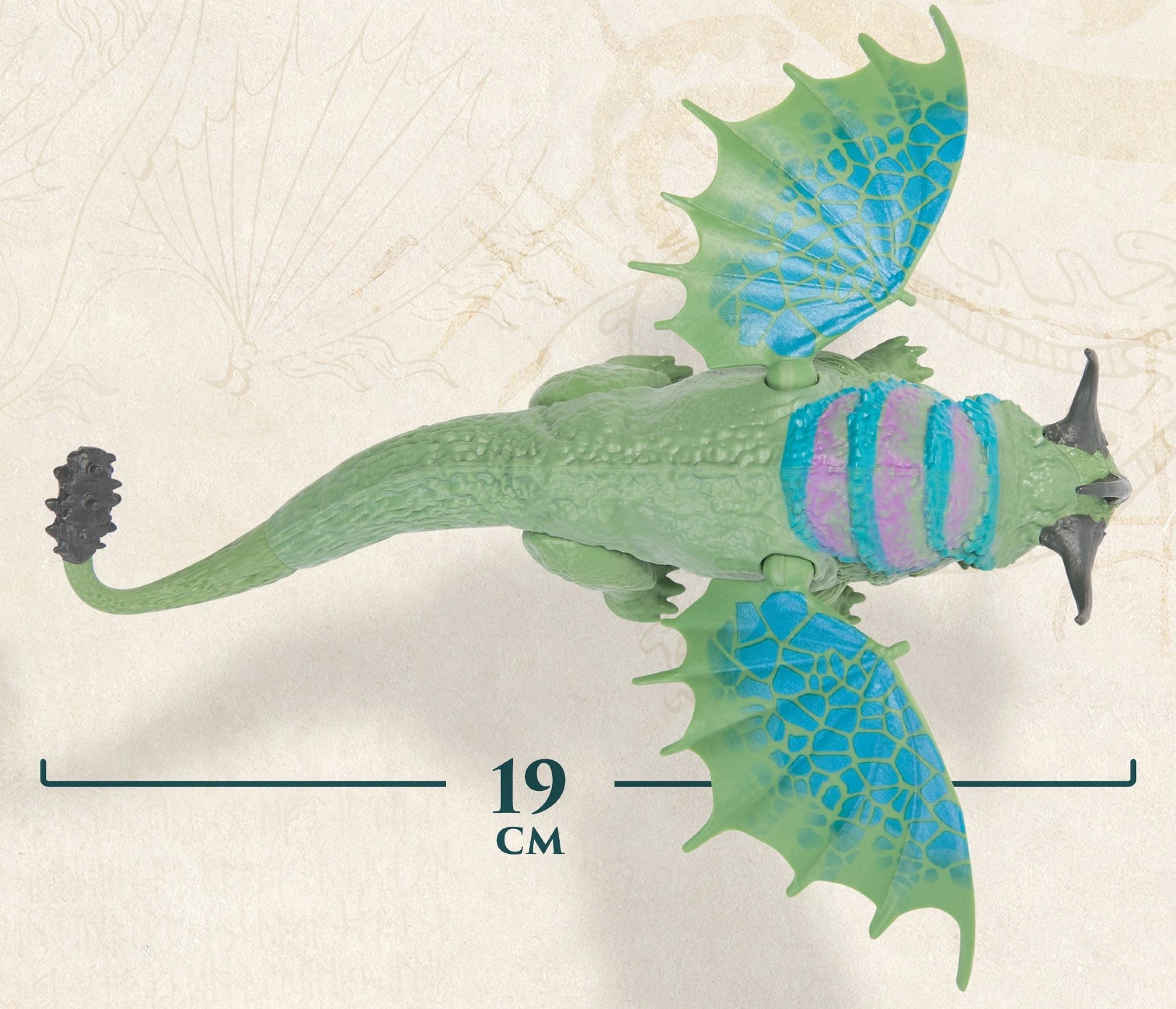 Figurica Rumblehorn navduši z masivno postavo, izrazitimi rogovi in velikimi krili z edinstvenim vzorcem. Navdihnjena je s filmskim svetom DREAMWORKS Dragons in verno zajema videz priljubljenega zmaja. Premični sklepi omogočajo dinamične poze – od vzleta nad Berkom do bojnih drž.