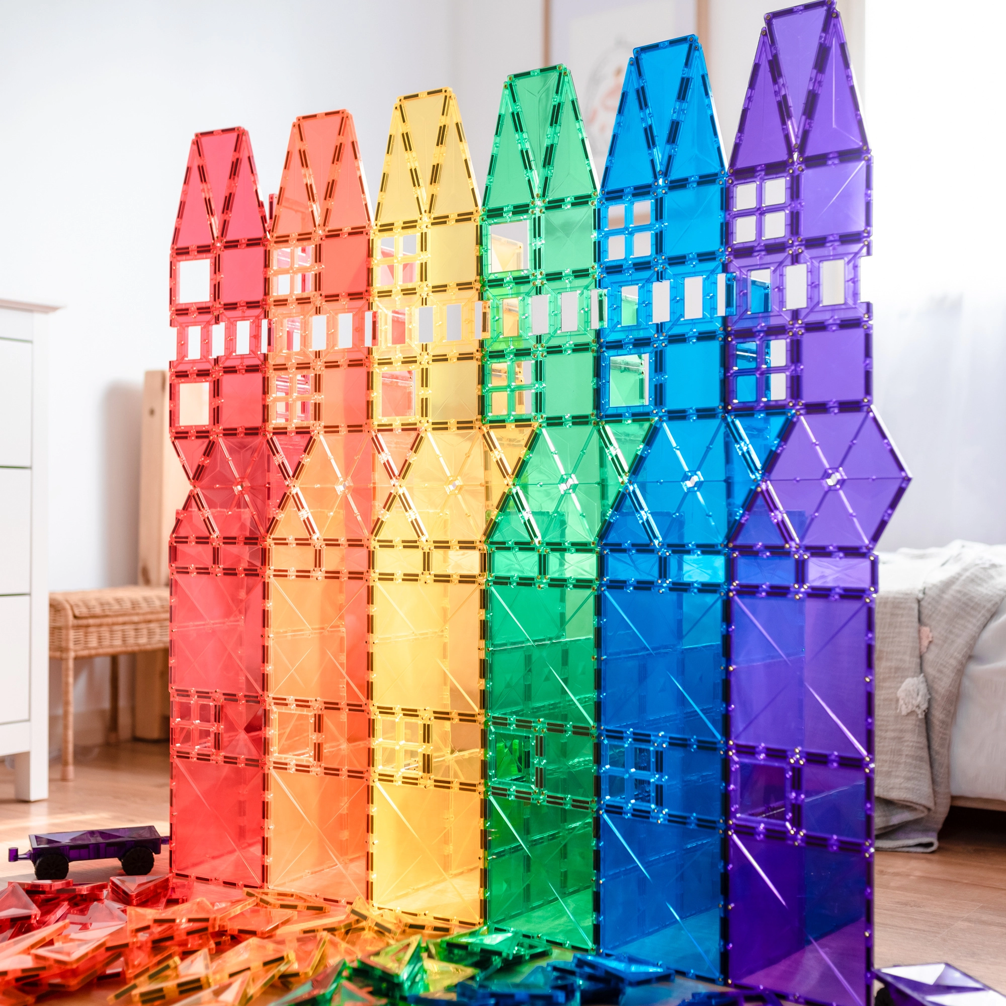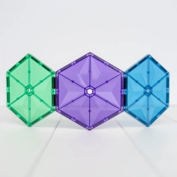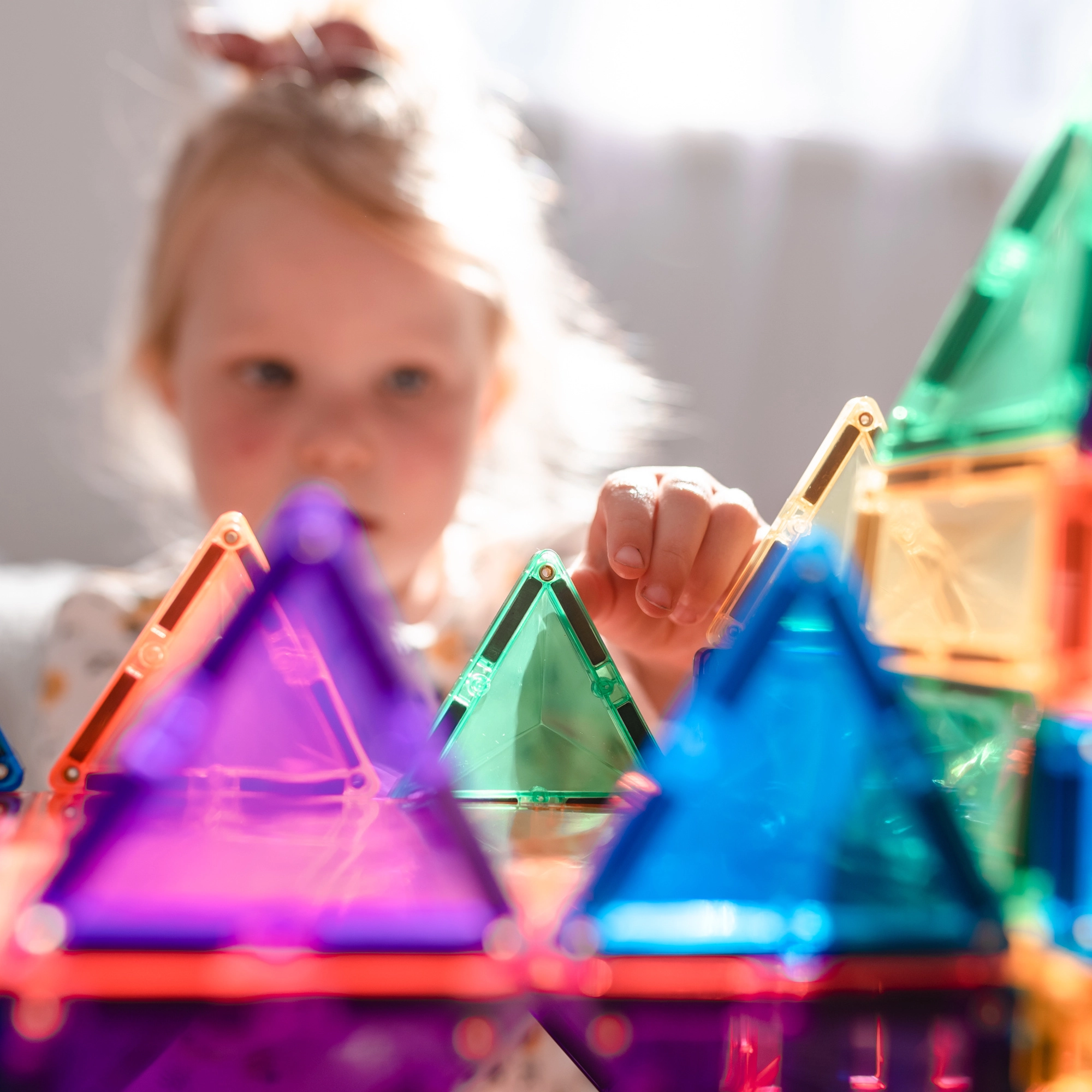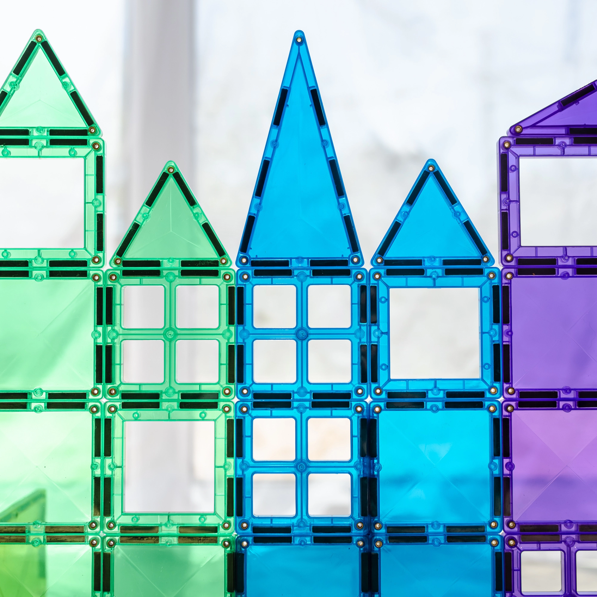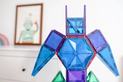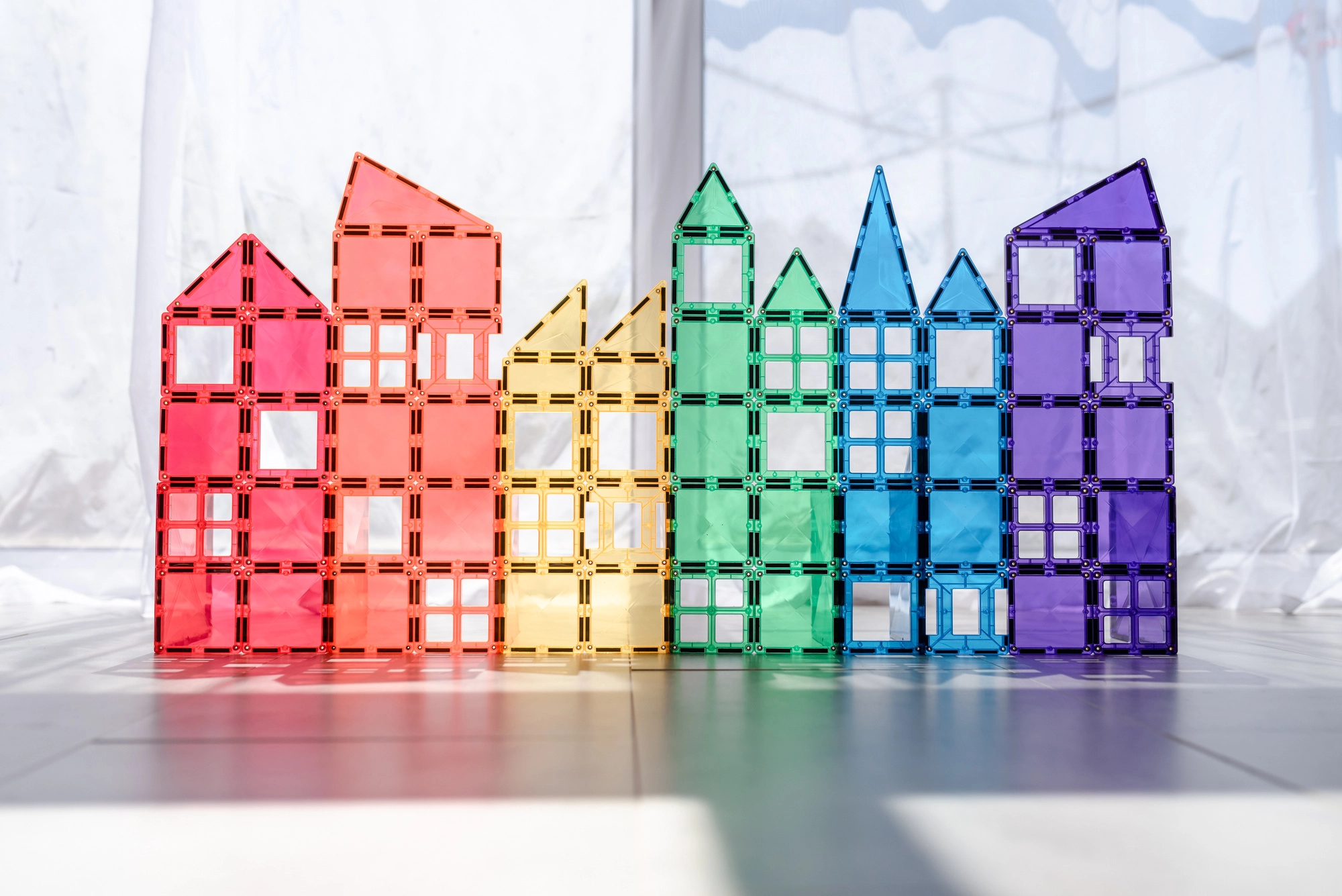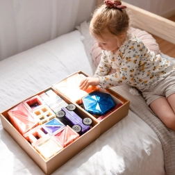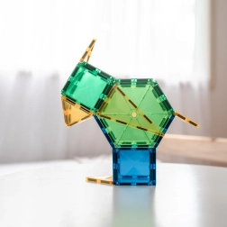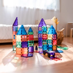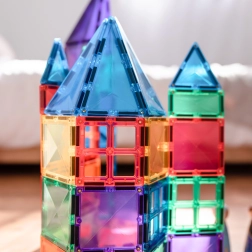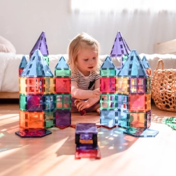 Prosojne magnetne ploščice v živih barvah omogočajo otrokom graditi visoke stolpe, gradove in hiše ter odkrivati svetlobo in sence pri igri ob oknu ali s svetilko.