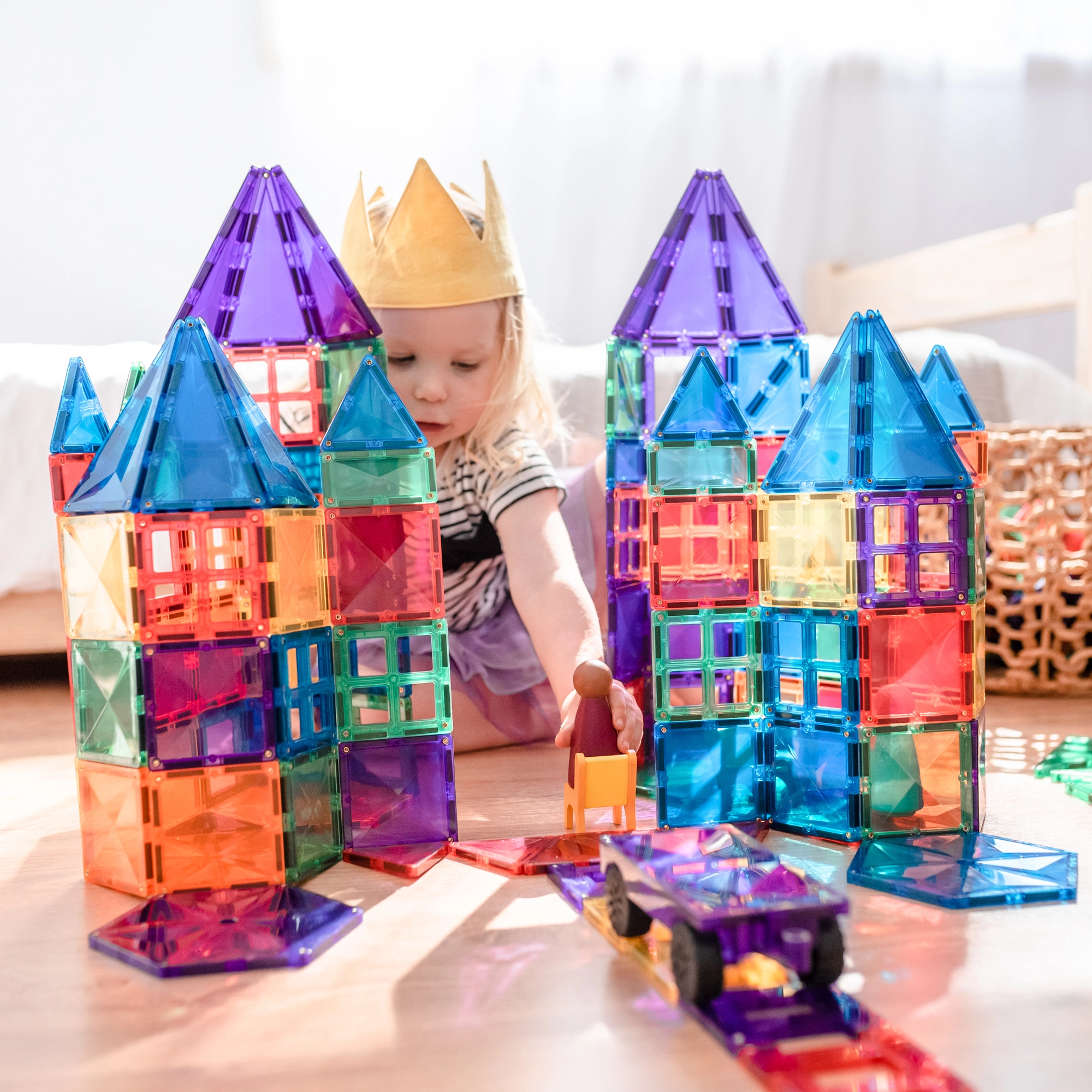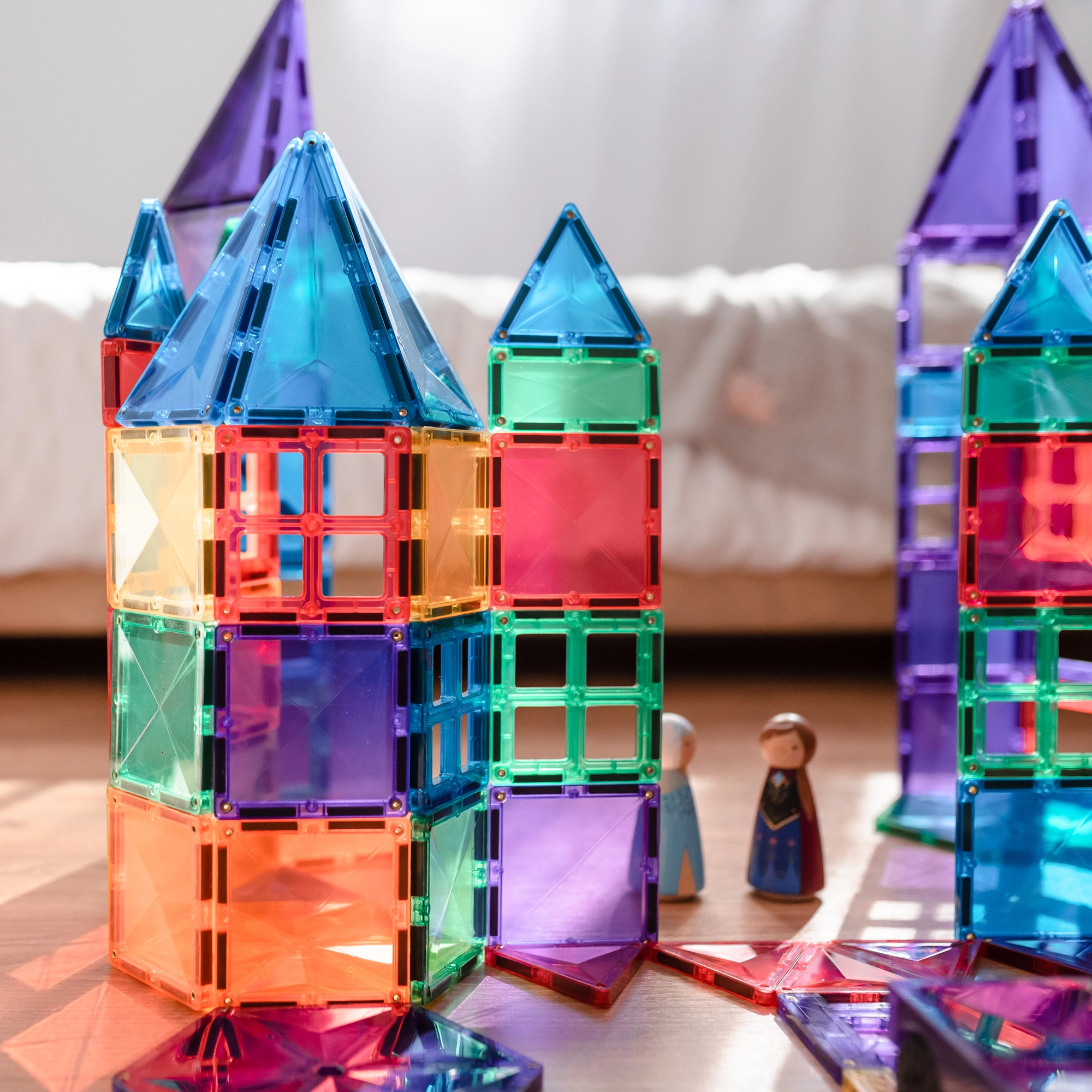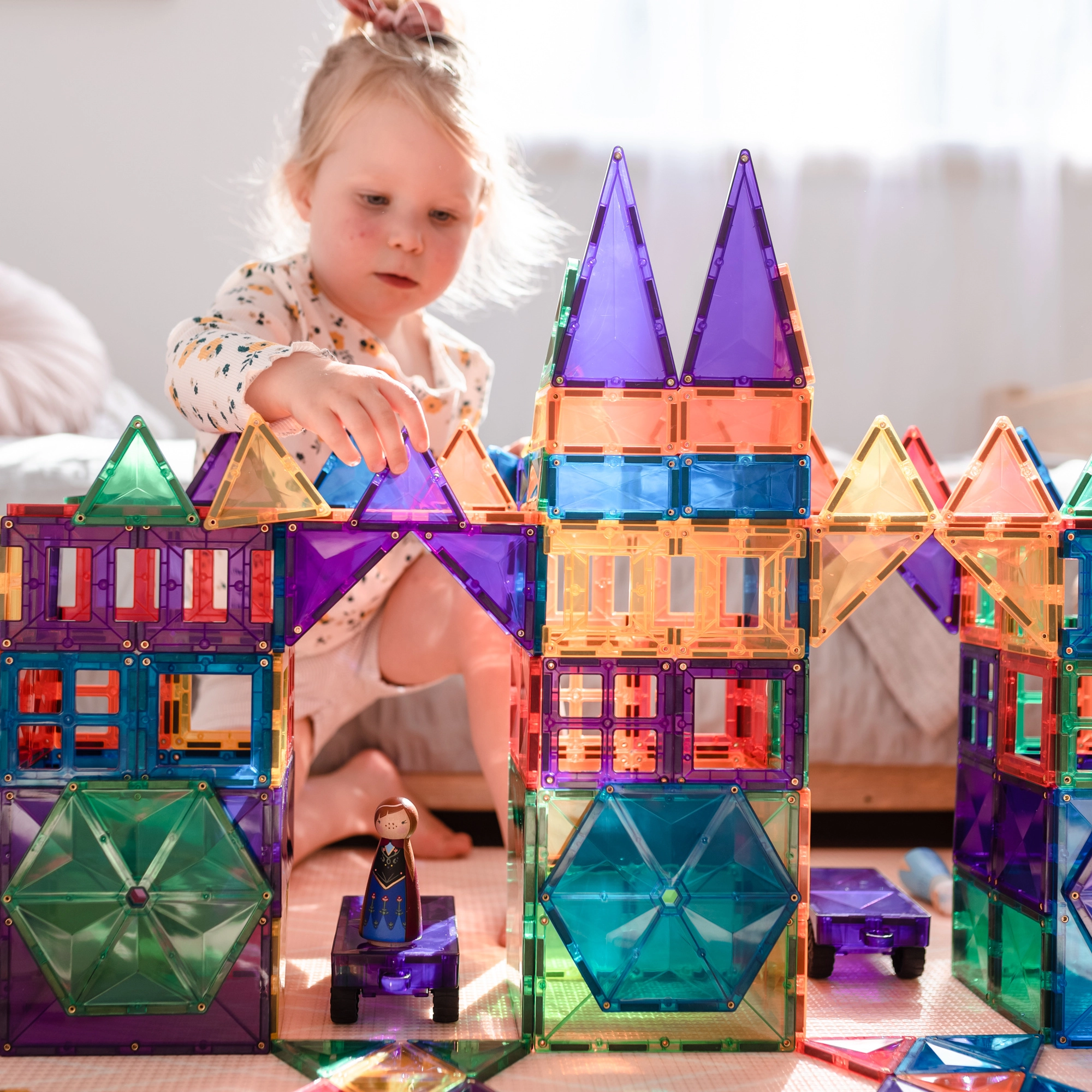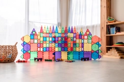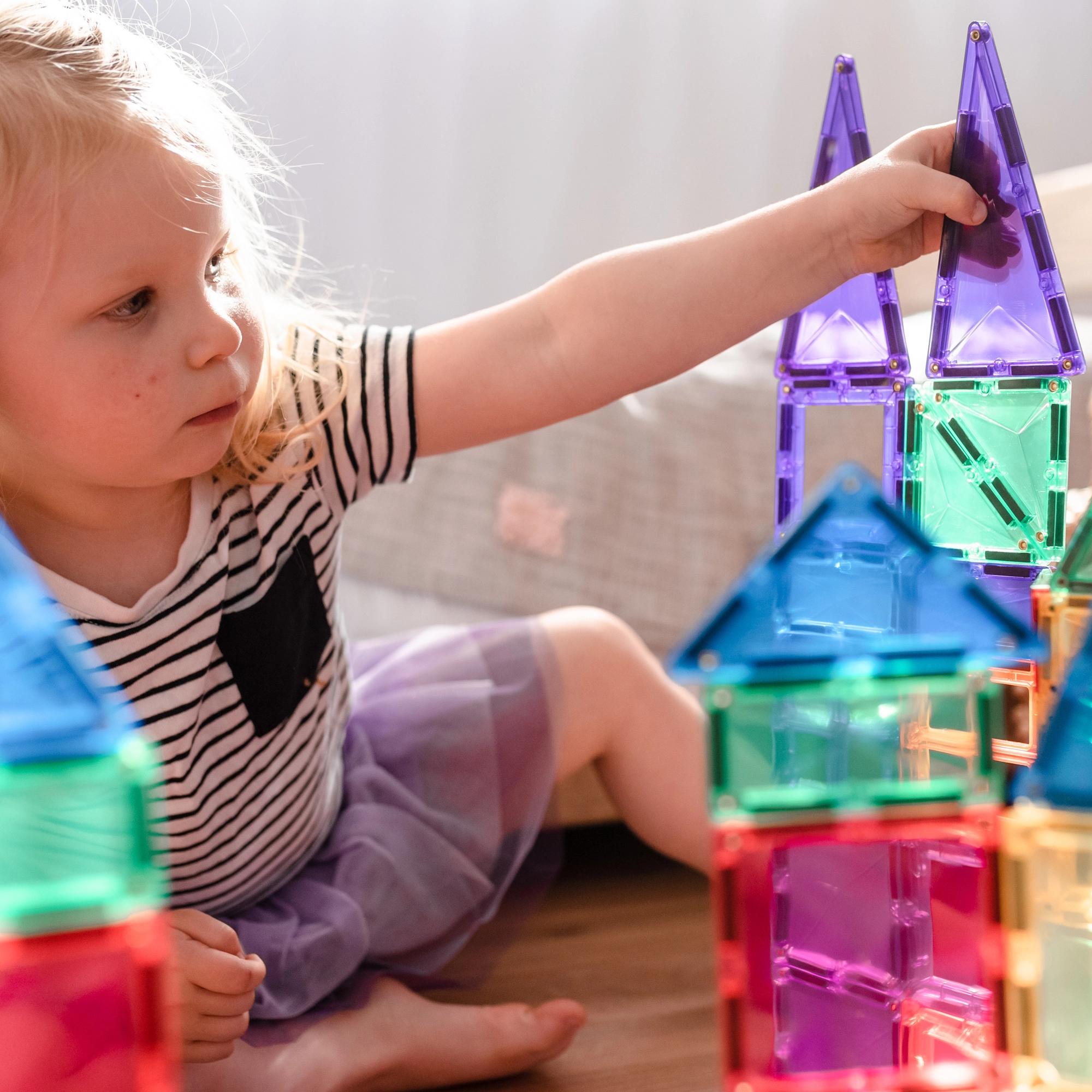Prosojne magnetne ploščice v živih barvah omogočajo otrokom graditi visoke stolpe, gradove in hiše ter odkrivati svetlobo in sence pri igri ob oknu ali s svetilko.