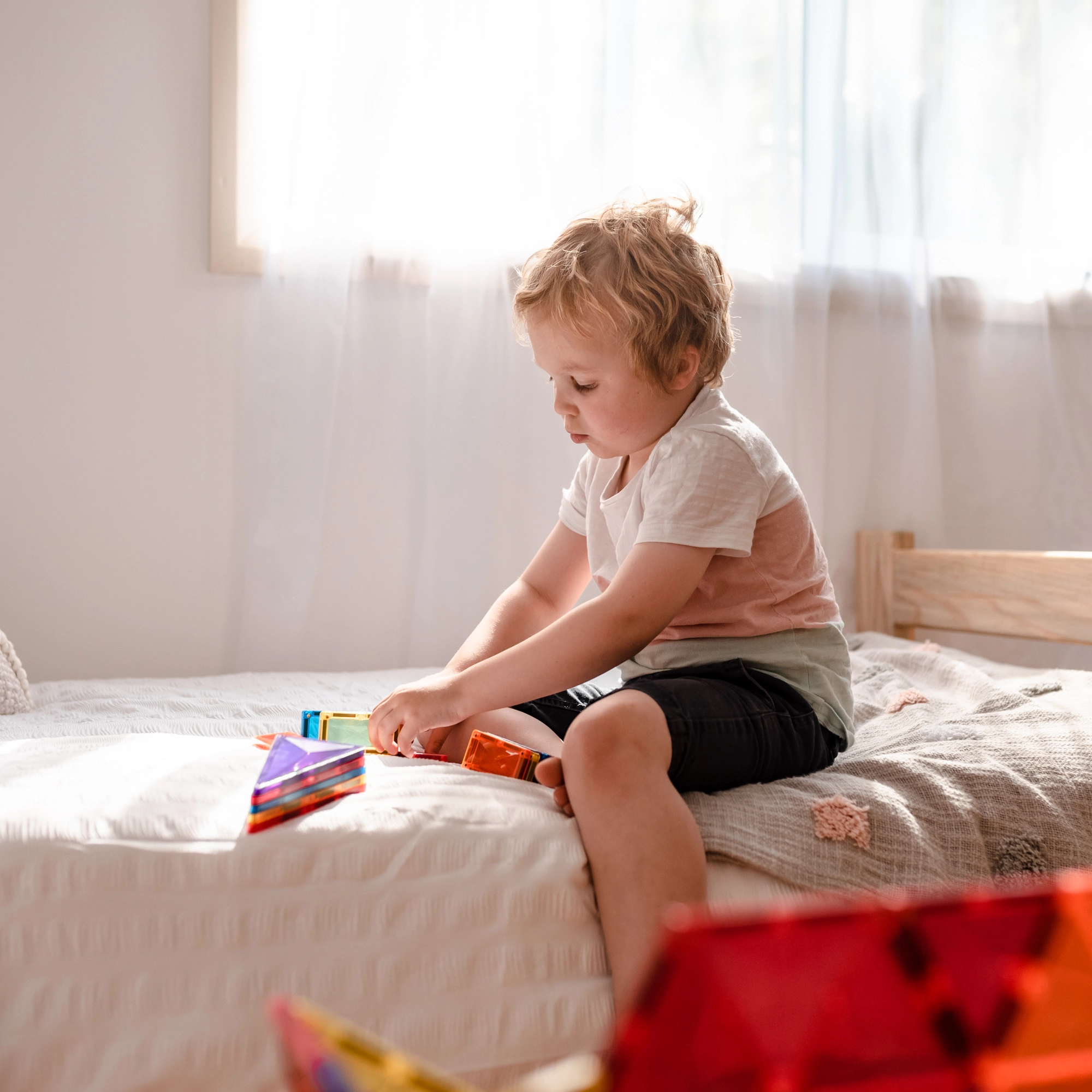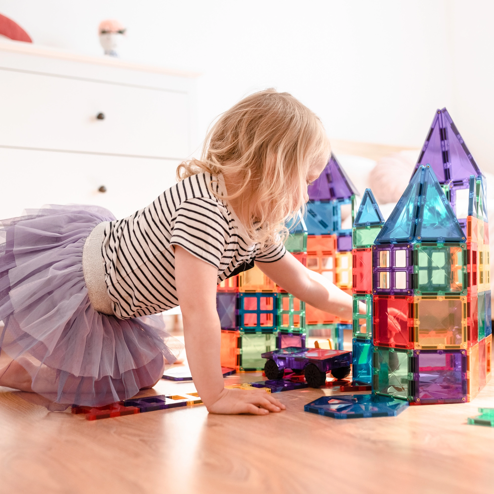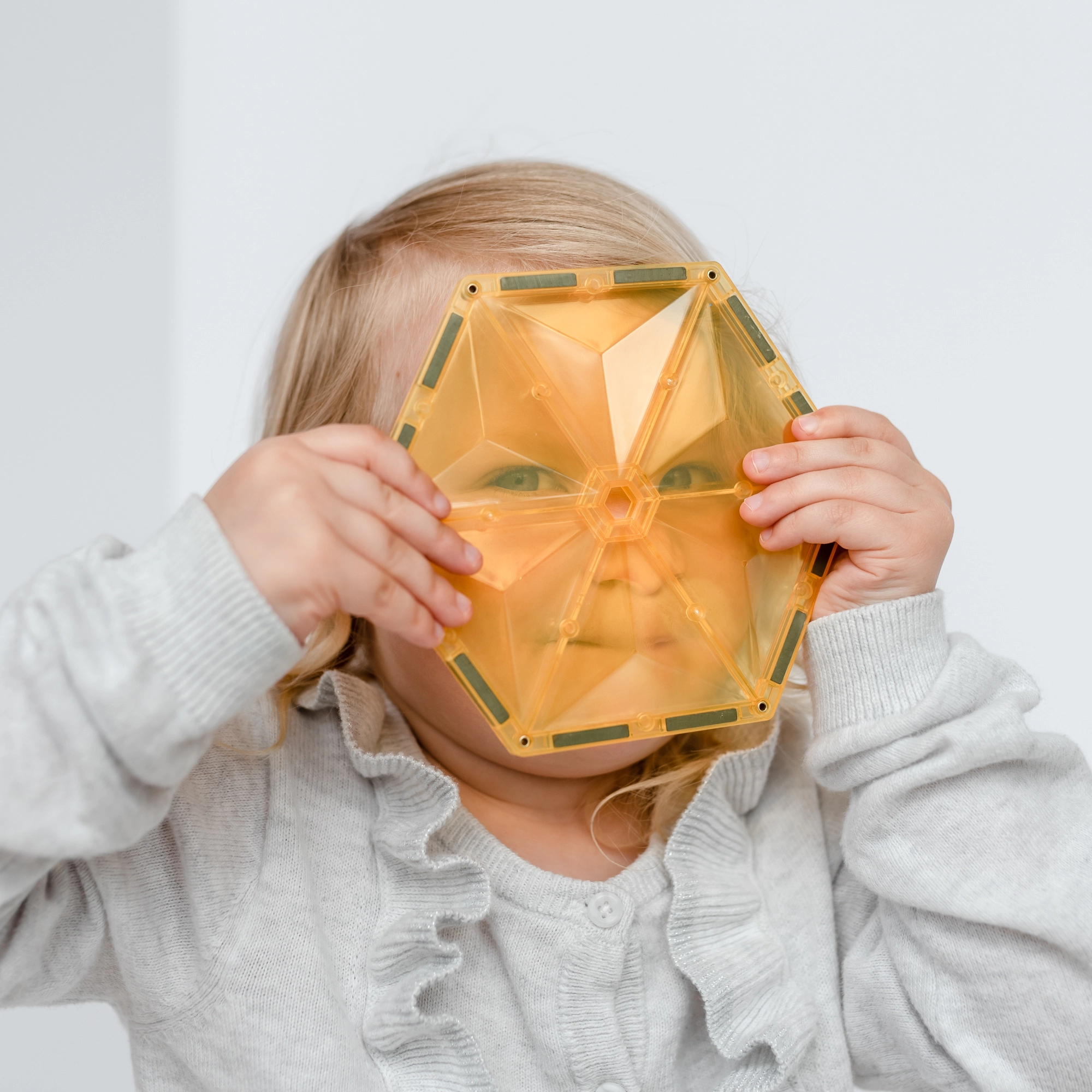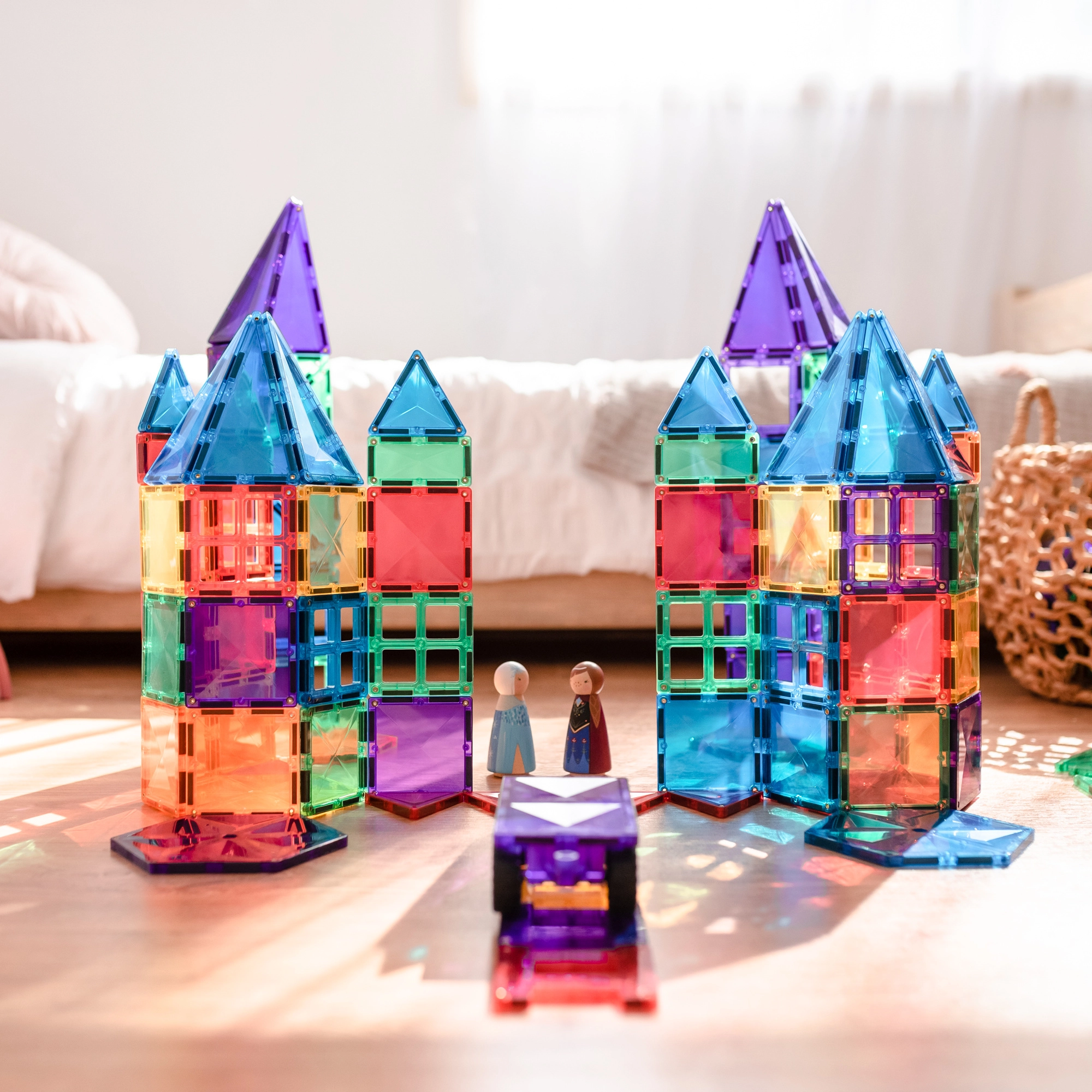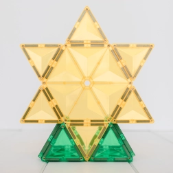 Prosojne magnetne ploščice v živih barvah omogočajo otrokom graditi visoke stolpe, gradove in hiše ter odkrivati svetlobo in sence pri igri ob oknu ali s svetilko.