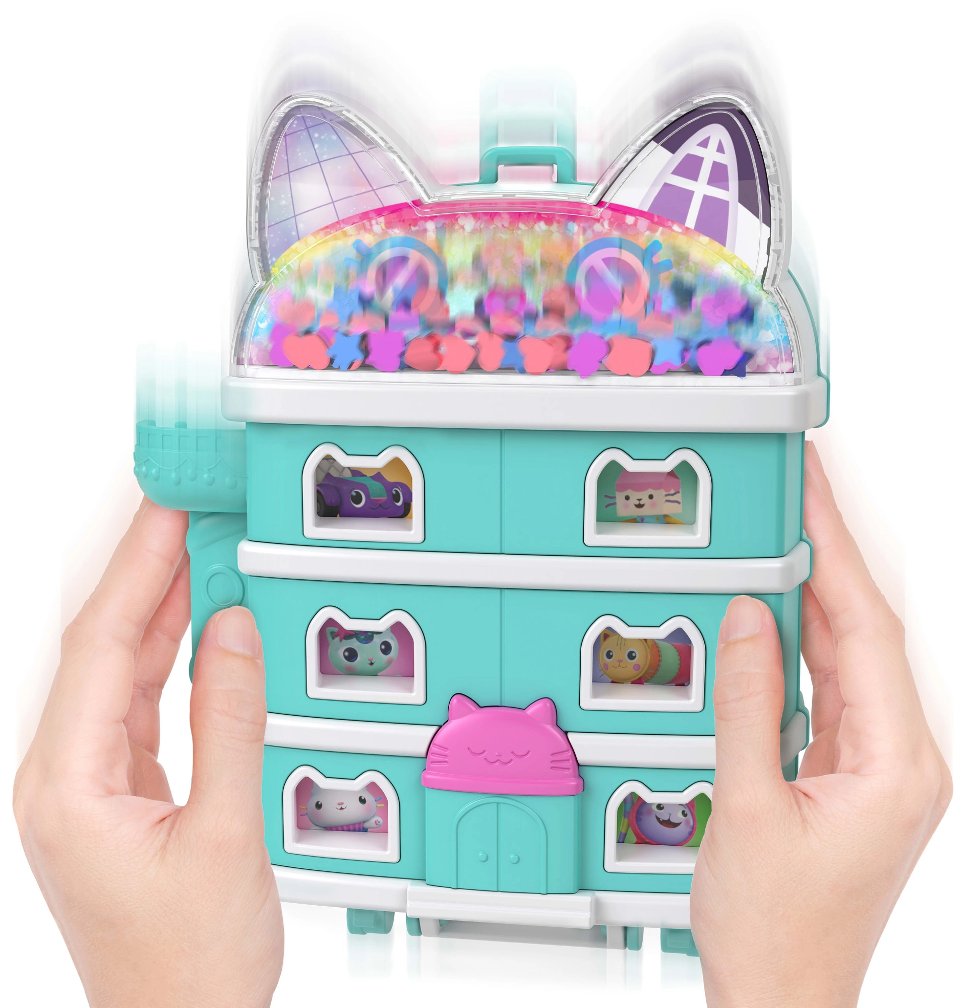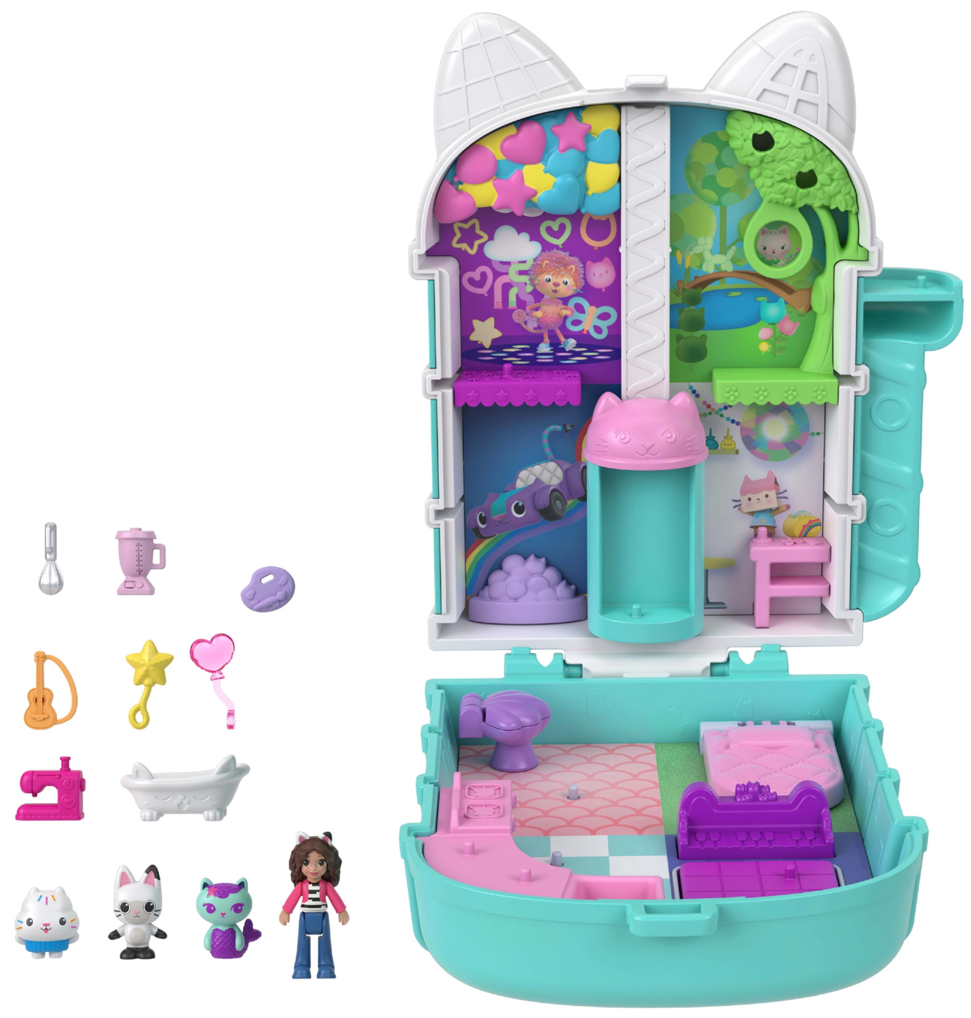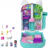 Kompaktni mačji domek Polly Pocket prinaša otrokom bogat svet domišljije v majhnem, prenosnem etuiju. Po odprtju se razkrije večnadstropna notranjost s tematskimi sobicami, bleščečo kupolo in premičnimi elementi, ki spodbujajo zgodbe, navdihnjene z GABBY’S DOLLHOUSE.