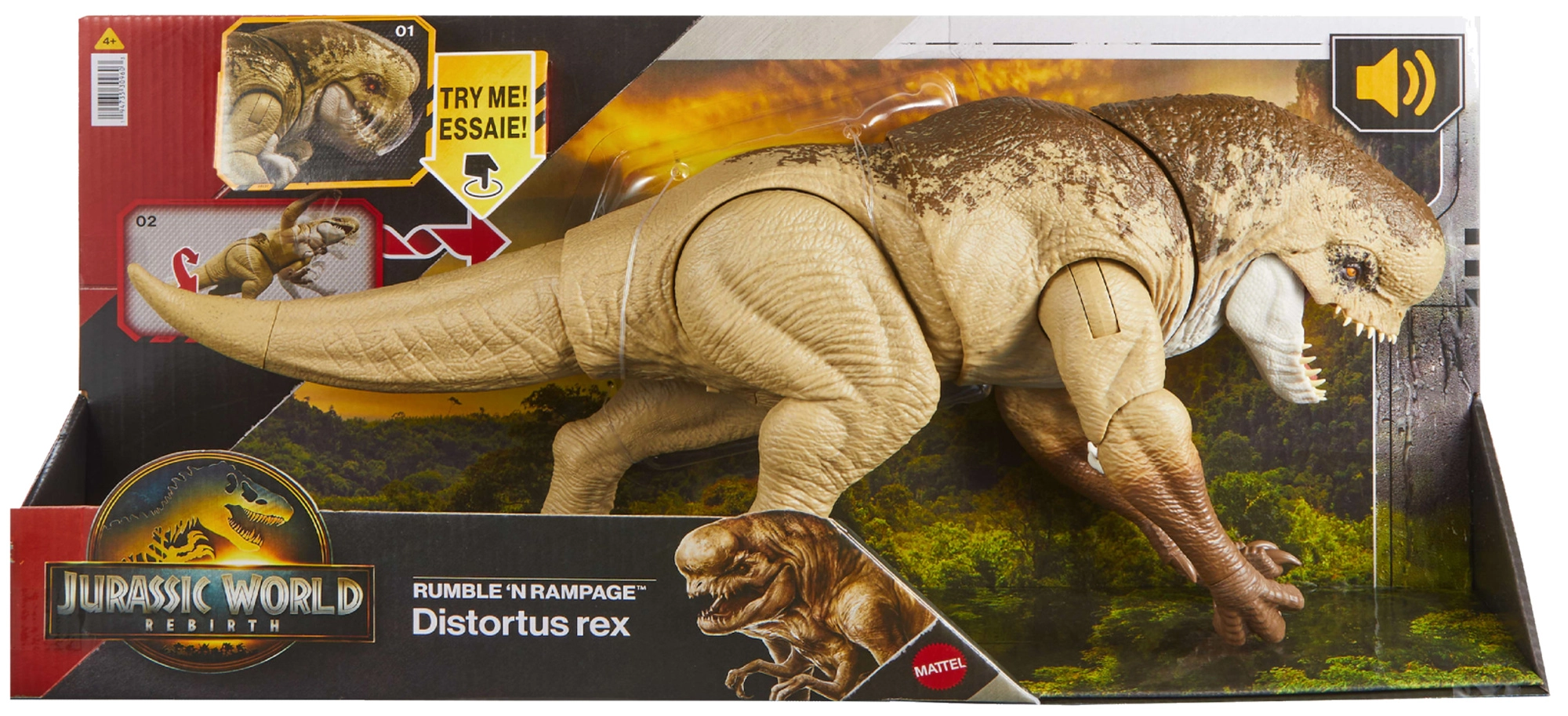 Pripravite se na veličastne spopade z realistično figuro Distortus Rex, visoko približno 50 cm, iz serije JURASSIC WORLD Rebirth znamke Mattel. Dinozaver ponuja strašen rjovenje na gumb, grizenje z gibom sprednjih okončin in bočni udarec, nadzorovan z repom. Zaradi podrobne teksture kože, visoke artikulacije in AR interakcije v aplikaciji je popolno darilo za male pustolovce in ljubitelje dinozavrov.