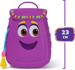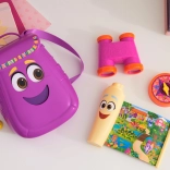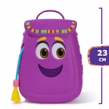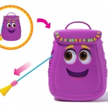Vijolični nahrbtnik s prijaznim obrazom ima praktično odpiranje in sprejme vse priložene dodatke – idealen za na pot ali za igro doma.