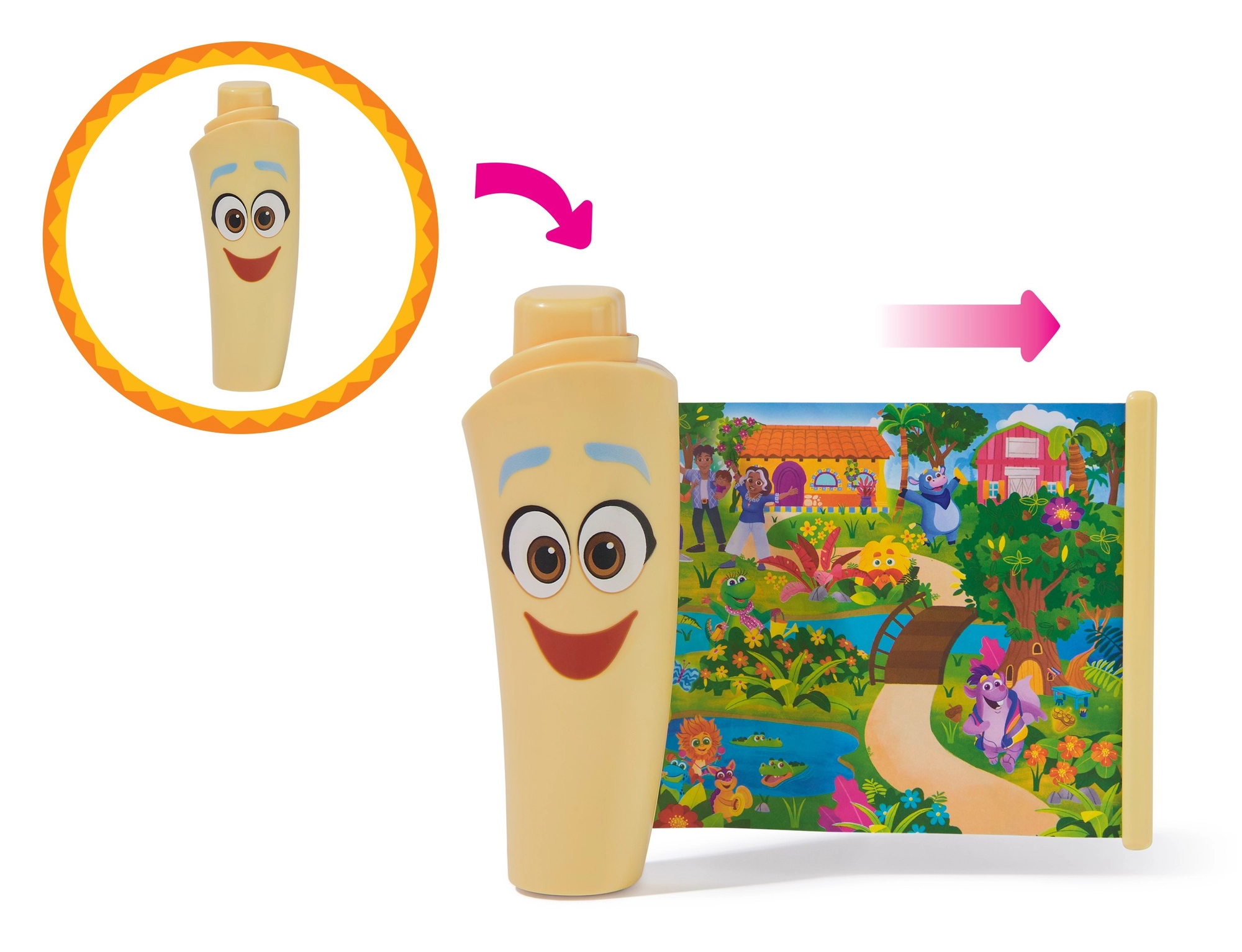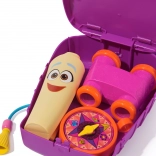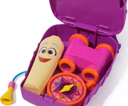 Priloženi so tematski pripomočki za igro raziskovalcev: daljnogled za približevanje oddaljenih predmetov, barvit kompas za določanje smeri in izvlečni zemljevid s slikovnim prizorom za načrtovanje odprav. Popolna igrača za razvoj domišljije, igre vlog in fine motorike.