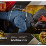 Vstopite v svet JURASSIC WORLD: Rebirth z realistično figurico Abelisaurus, visoko približno 25 cm. Dinosaver ima muskulozno, atletsko postavo, temno modro-črno barvo in izrazito teksturo lusk, od drobnih na trebuhu do poudarjenih plošč na hrbtu in glavi. Zaradi zvočnih in mehanskih efektov je akcija še bolj živa.