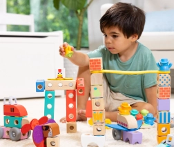 Sestavljanka razvija ključne spretnosti: fino motoriko, koordinacijo roka–oko, ustvarjalnost in logično mišljenje. Otroci lahko zlagajo, spajajo, vrtijo in vozijo s končanimi stvaritvami. Kakovosten les s certifikatom FSC in trpežna izdelava zagotavljata dolgo življenjsko dobo tudi pri vsakodnevni igri.