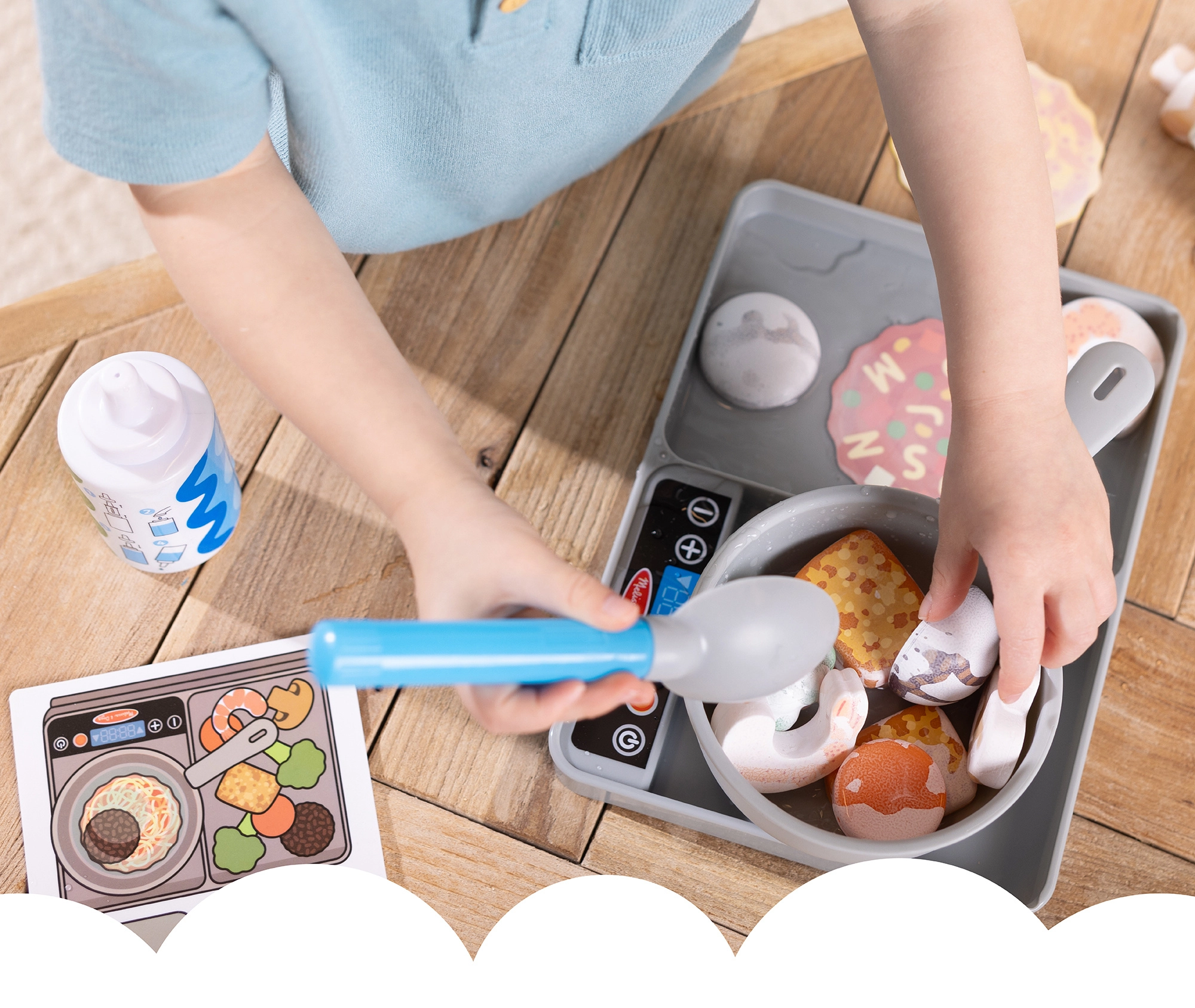 Komplet Simmer & Stir je zasnovan tako, da otrokom realistično približa kuhanje in hkrati spodbuja vsakodnevne spretnosti. Zahvaljujoč živilom, ki menjavajo barvo (iz »zamrznjenih« v »skuhane«) otroci takoj vidijo, kaj se zgodi po polivanju z vodo iz stekleničke ali po zajemanju in mešanju z žlico.