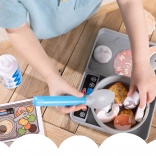 Pladenj s posnetkom kuhalne plošče, loncem in mešalno žlico ustvarja realistno okolje za igro kuharja. Otroci lahko mešajo, prelivajo in strežejo kot v pravi kuhinji.