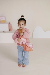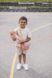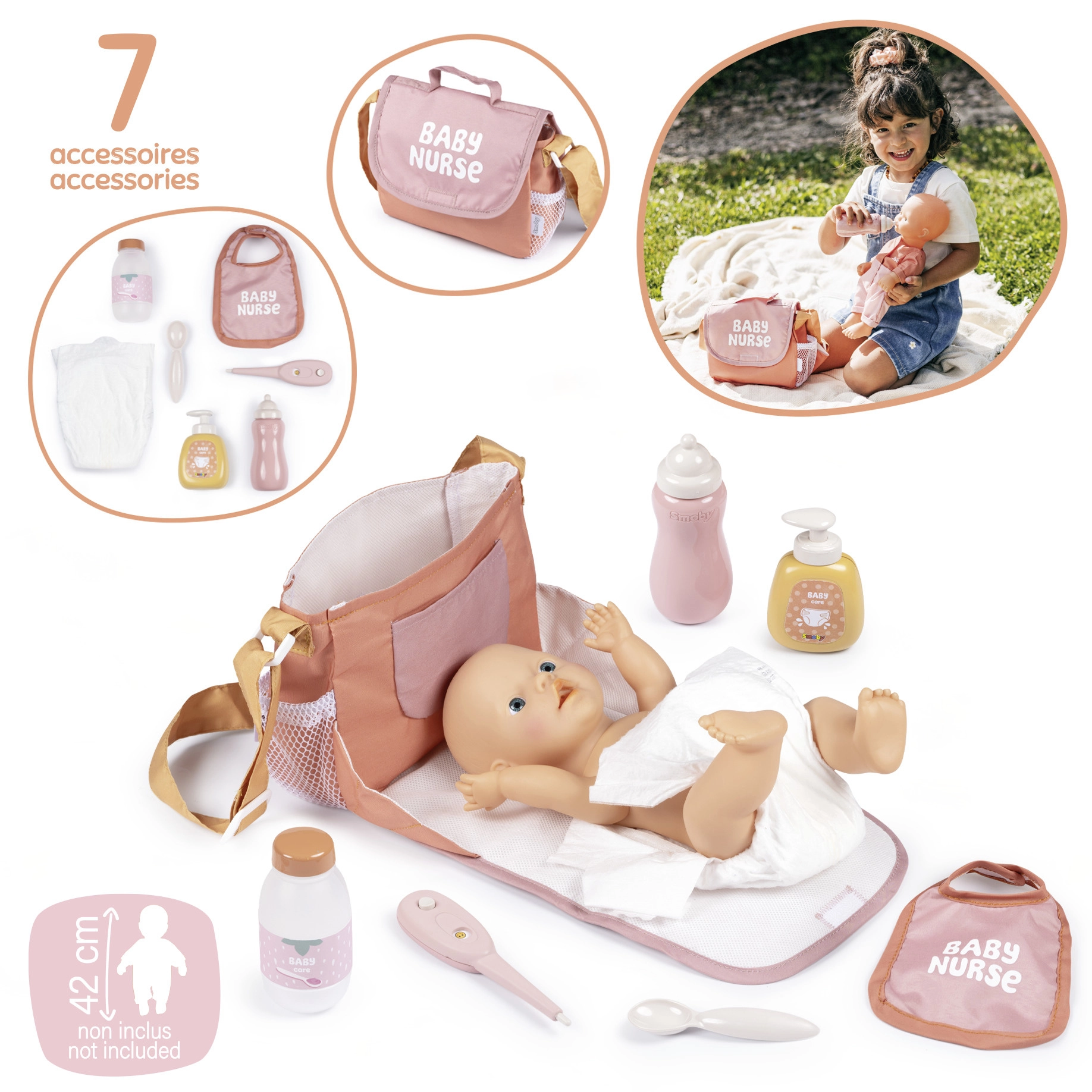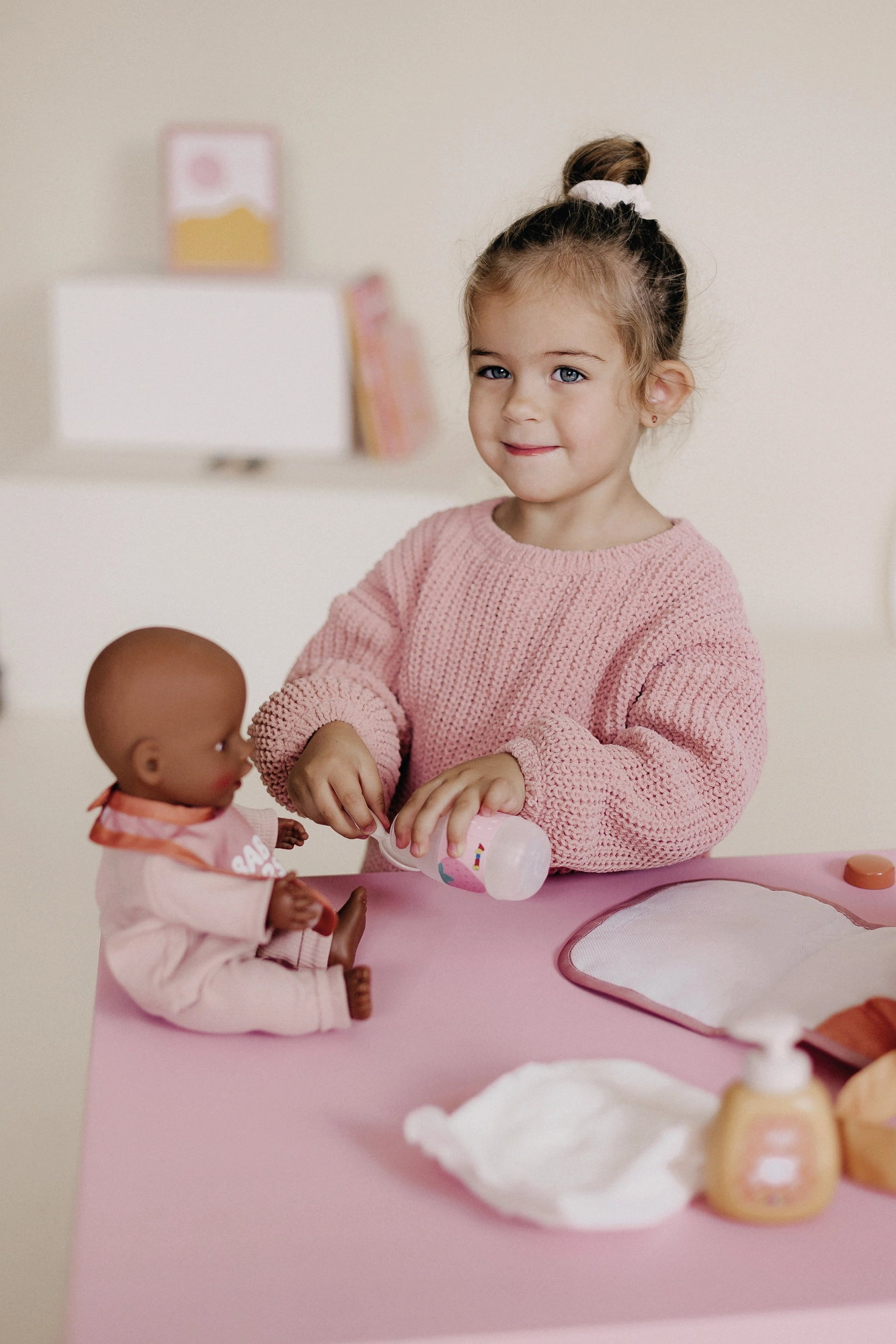 V setu je vse za vsakodnevno igro in posnemanje resnične nege: steklenička za mleko, termometer, sirup z žličko, dozirnik za šampon, slinček in plenička za punčko. Set razvija kreativnost, fino motoriko ter uči odgovornosti in nežne skrbi.
