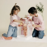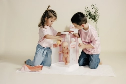 Odkrijte realistično nego punčke z elegantno rožnato-belo tuš kabino BABY NURSE. Ob pritisku na gumb začne iz tuša teči voda, zato lahko otroci punčko resnično »okopljejo« in jo nato zavijejo v mehko brisačo s kapuco. Zahvaljujoč praktičnemu držalu lahko punčka pod tušem sama stoji, otroci pa imajo proste roke za umivanje in izpiranje.