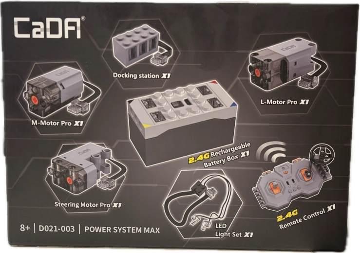 Razširite svoje CADA komplete z realističnim pogonom in osvetlitvijo zahvaljujoč kompletu Power System Max. Dobili boste natančno 2,4 GHz upravljanje brez motenj, dolgo avtonomijo akumulatorja in združljivost s številnimi modeli standardne velikosti. V paketu najdete tri zmogljive motorje, LED osvetlitev, daljinski upravljalnik in USB polnilni kabel – vse, kar potrebujete za dvig zabave na nov nivo.