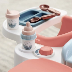 Mizica v nežnih pastelnih tonih je idealna za otroško sobo. Banjica z izlivom, organizatorji za stekleničke in pripomočke ter preklopni pokrov previjalne površine poskrbijo za preglednost in red. 13 kosov dodatkov (stekleničke, žlička, posodice ipd.) naredi igro privlačno in realistično.