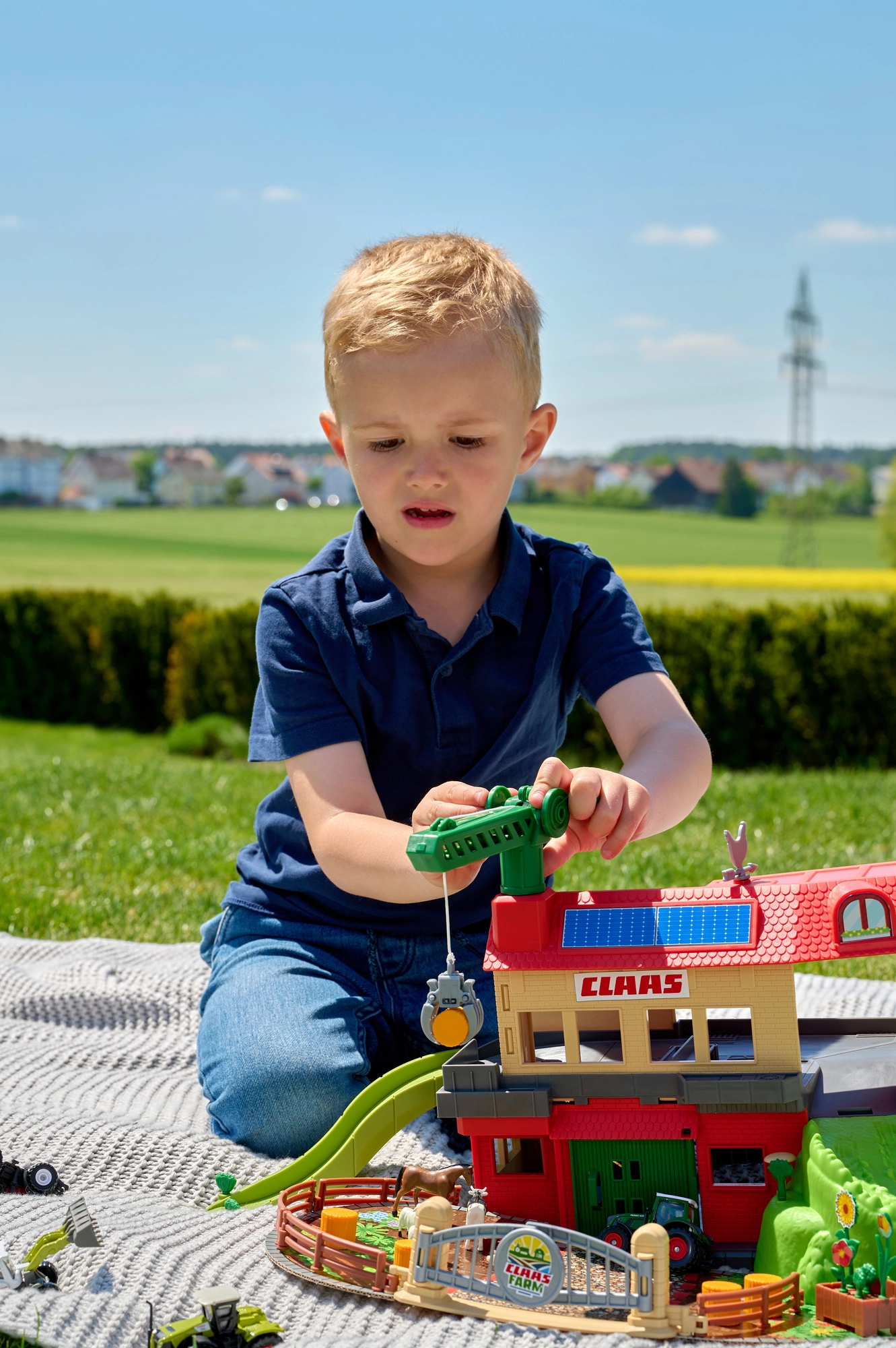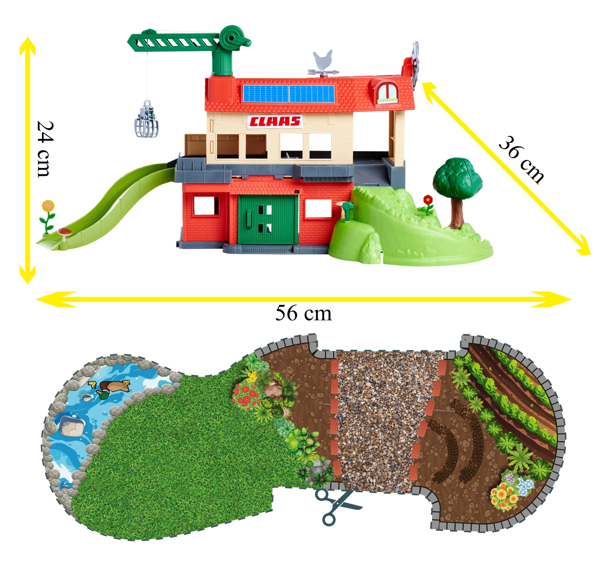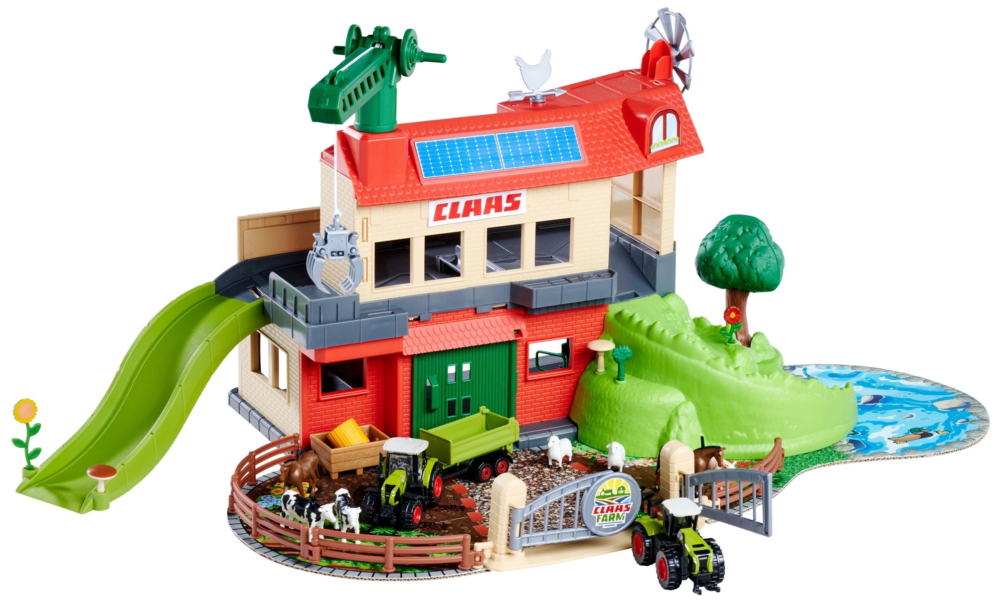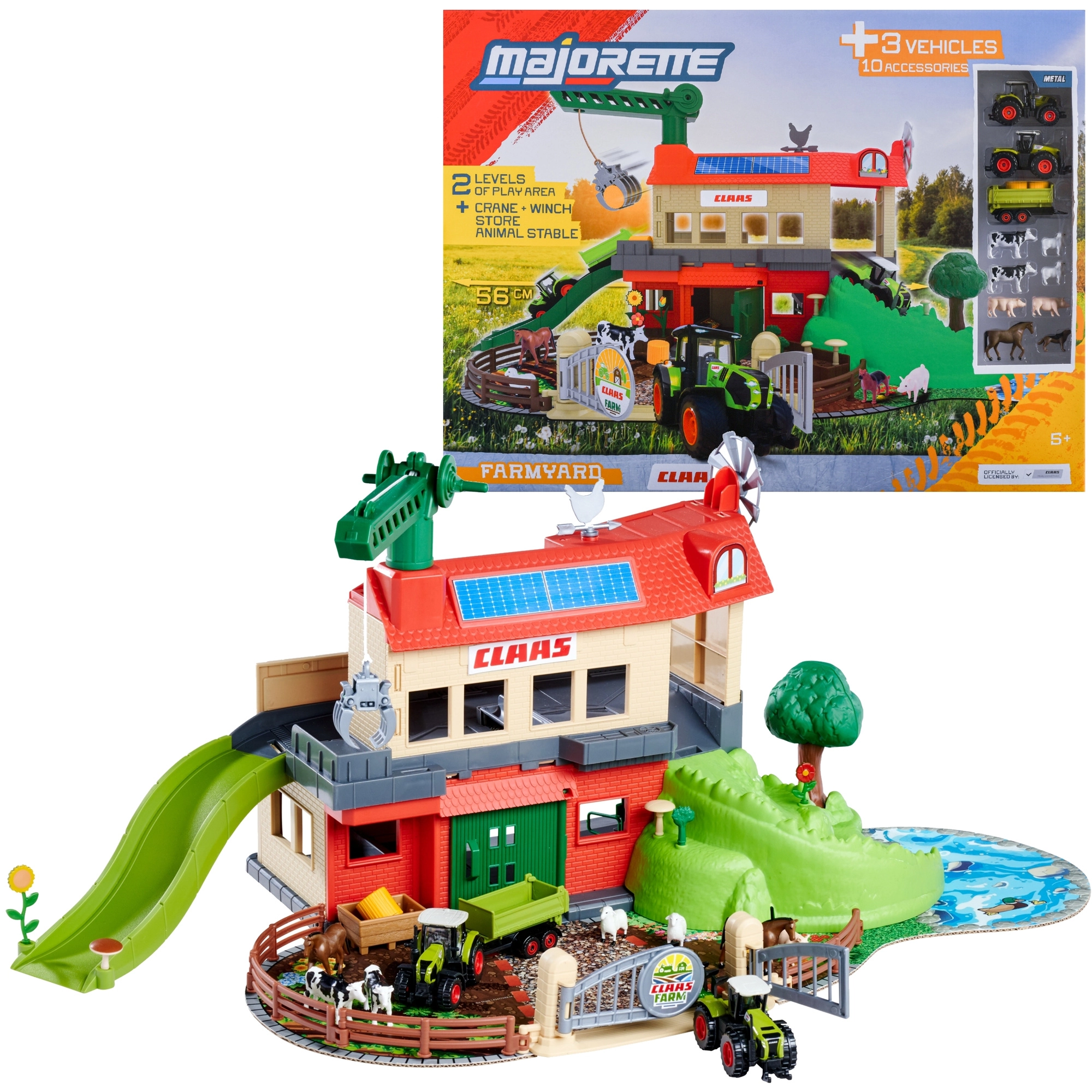 Velika kmetija CLAAS otrokom prinaša pristno podeželsko doživetje. Dvonadstropna zasnova s skednjem, rampami in ogradami nudi veliko prostora za vozila in živali, medtem ko funkcionalni žerjav s škripecem omogoča dvigovanje bal sena ali dodatkov med ravnmi. Licencirani modeli CLAAS navdušijo z realističnim videzom in gladkim tekom koles.