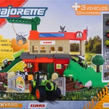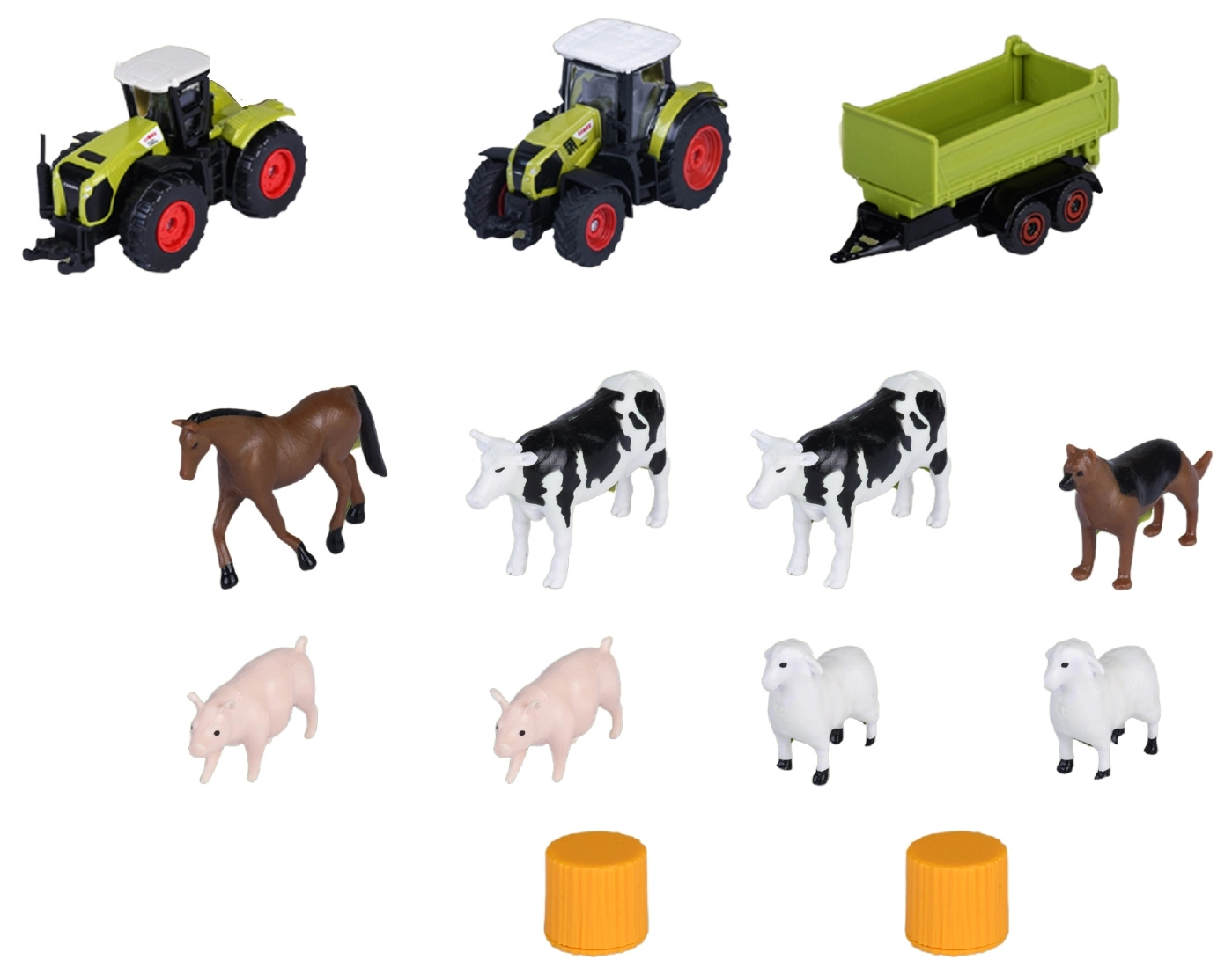 - 2 traktorja (1:64), prikolica, 10 figur živali, dvonadstropni skedenj z rampami, žerjav s škripecem, ograde in dodatki