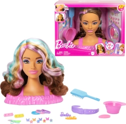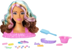 BARBIE glava za česanje prinaša otrokom neskončne možnosti ustvarjanja pričesk. Dolgi rjavi lasje z rožnatimi, oranžnimi in turkiznimi prameni odlično držijo obliko in vabijo k pletanju, pripenjanju in okraševanju. Zabavno čarovnijo dodajo sponke in ustnice, ki spreminjajo barvo ob uporabi vode in gobice.