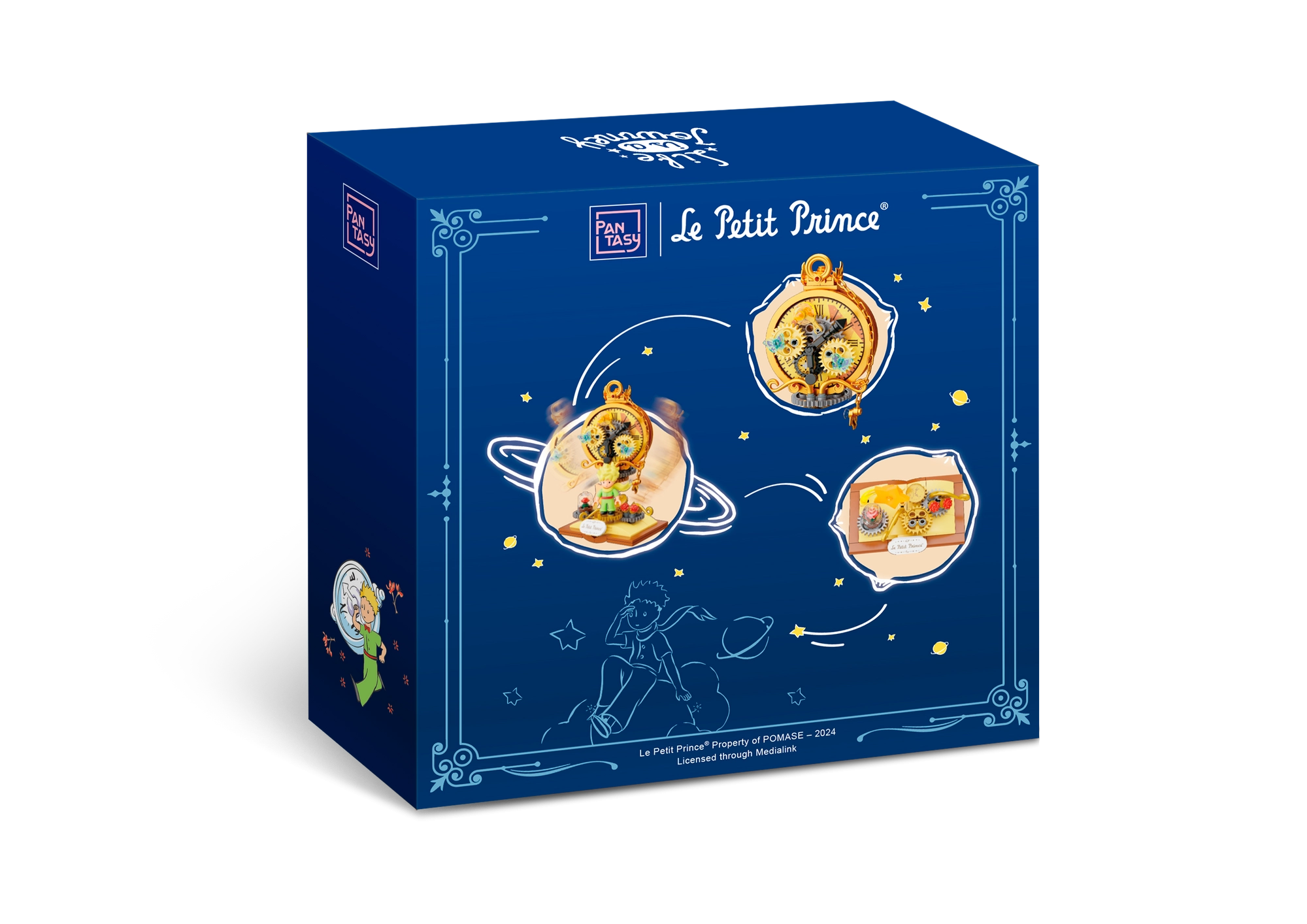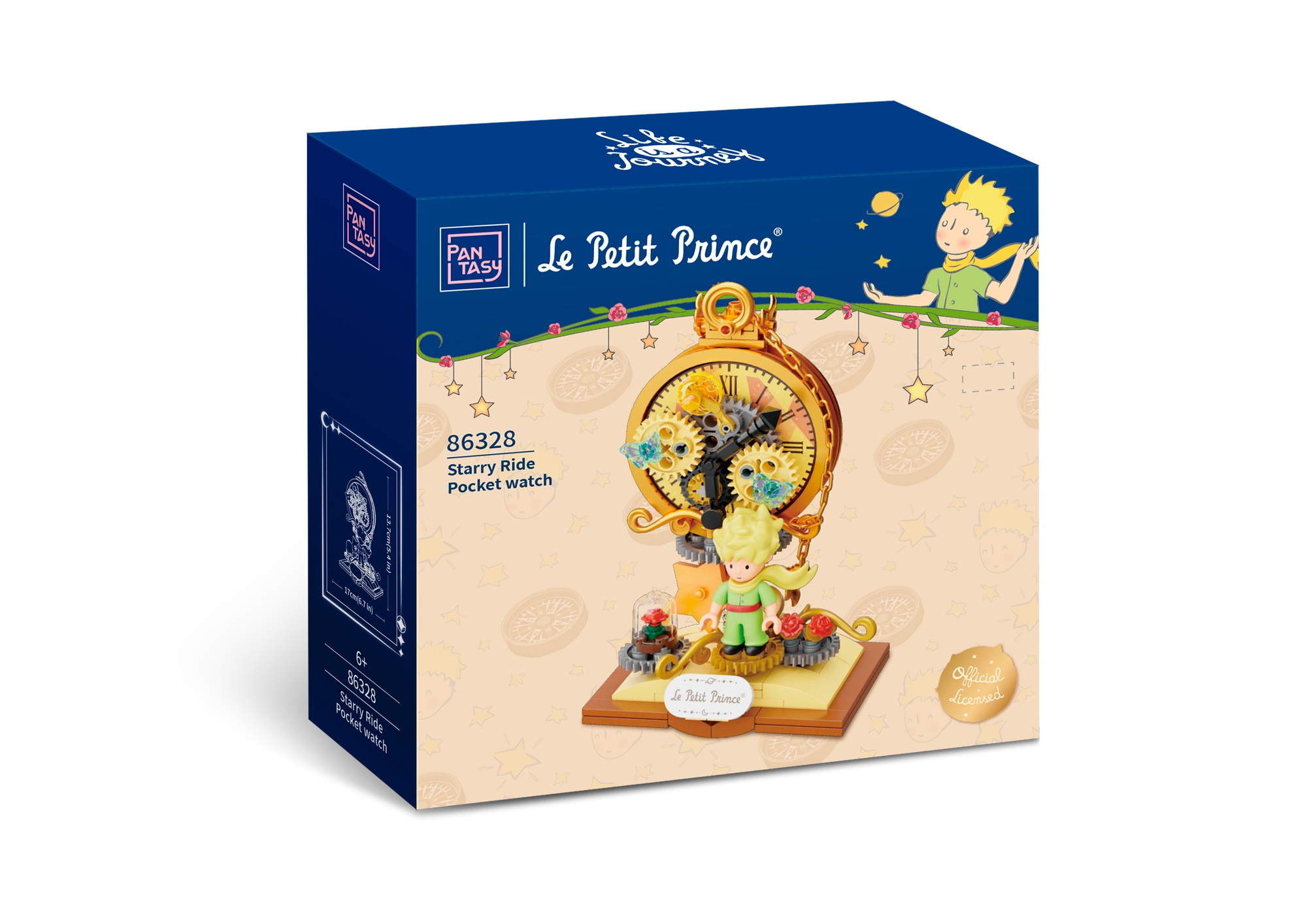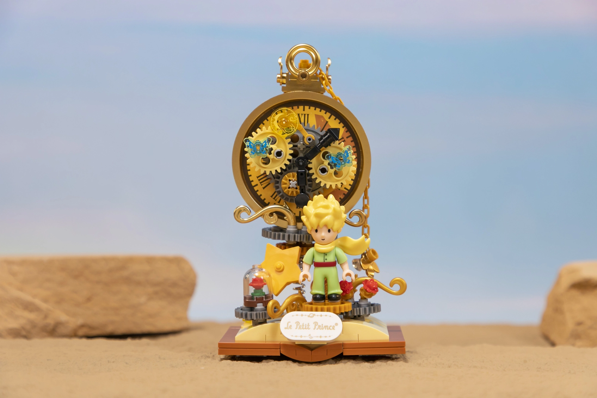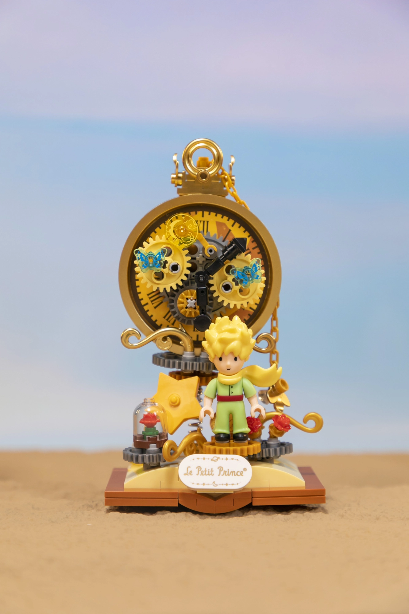 Ta licencirani set kock PANTASY prenaša čar sveta Le Petit Prince v prepričljivo dekoracijo: Mali princ pred stiliziranim številčnikom z zlatimi zobniki, dopolnjen s simbolično vrtnico pod zvonom in zvezdnimi detajli. Pastelne barve in nežne linije prikličejo izvirne ilustracije, zato bo model odlično izstopal na polici, pisalni mizi ali v otroški sobi.