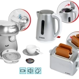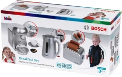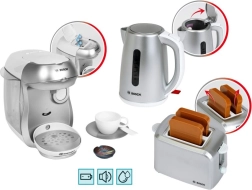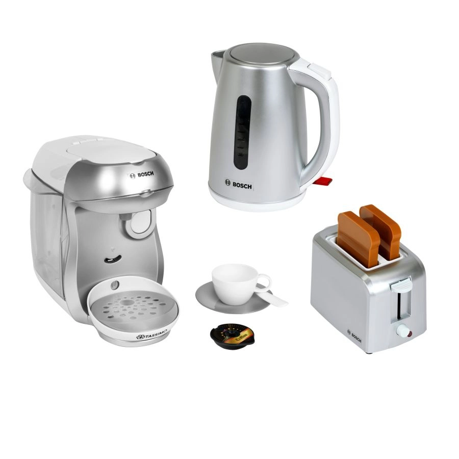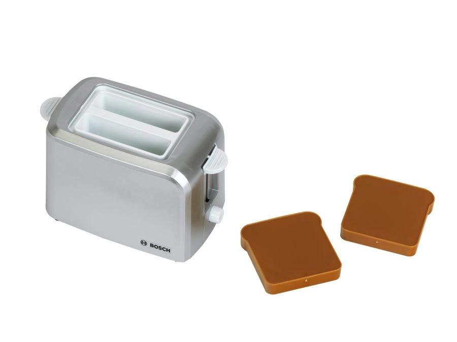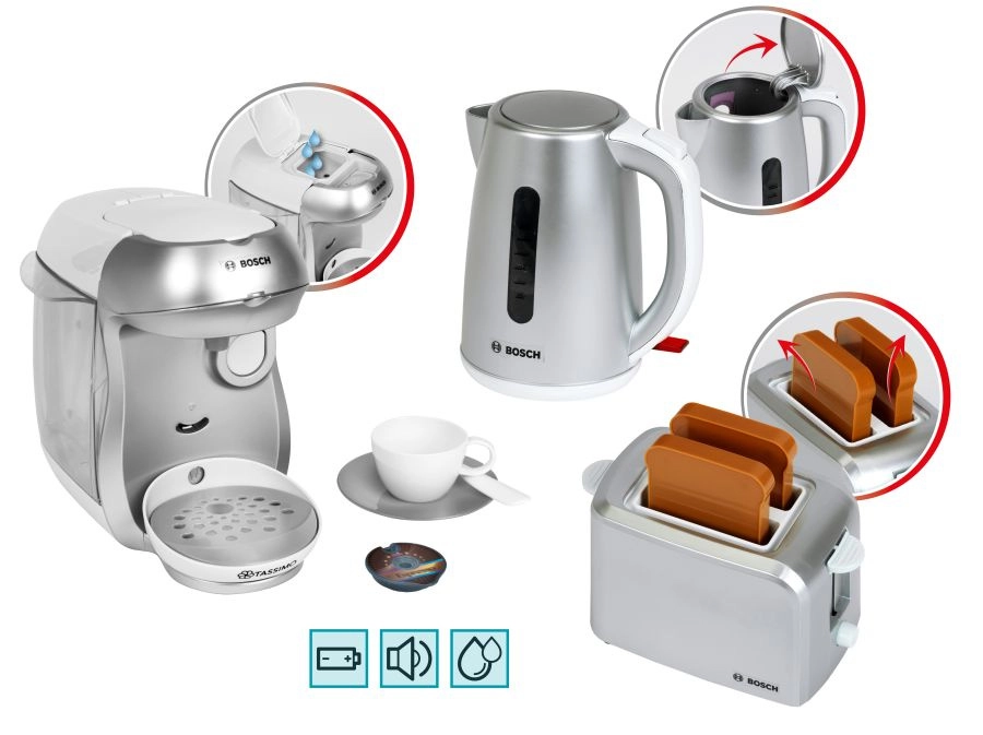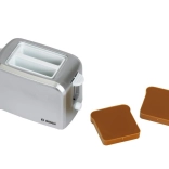 Del kompleta je tudi kompaktni toaster v sivi barvi z samodejnim izskočenjem dveh toastov, mehanizmom za dvigovanje in gumbom z imitacijo regulacije. Set dopolnjuje otroški električni grelnik vode z odpirljivim pokrovom in stikalom za še bolj realistično igro.
