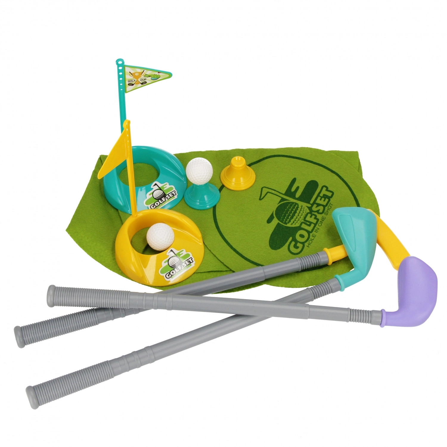 Vse, kar otroci potrebujejo za takojšnjo igro: tri palice, dve luknji z zastavicami, dve žogici in podloga za vadbo puttanja.